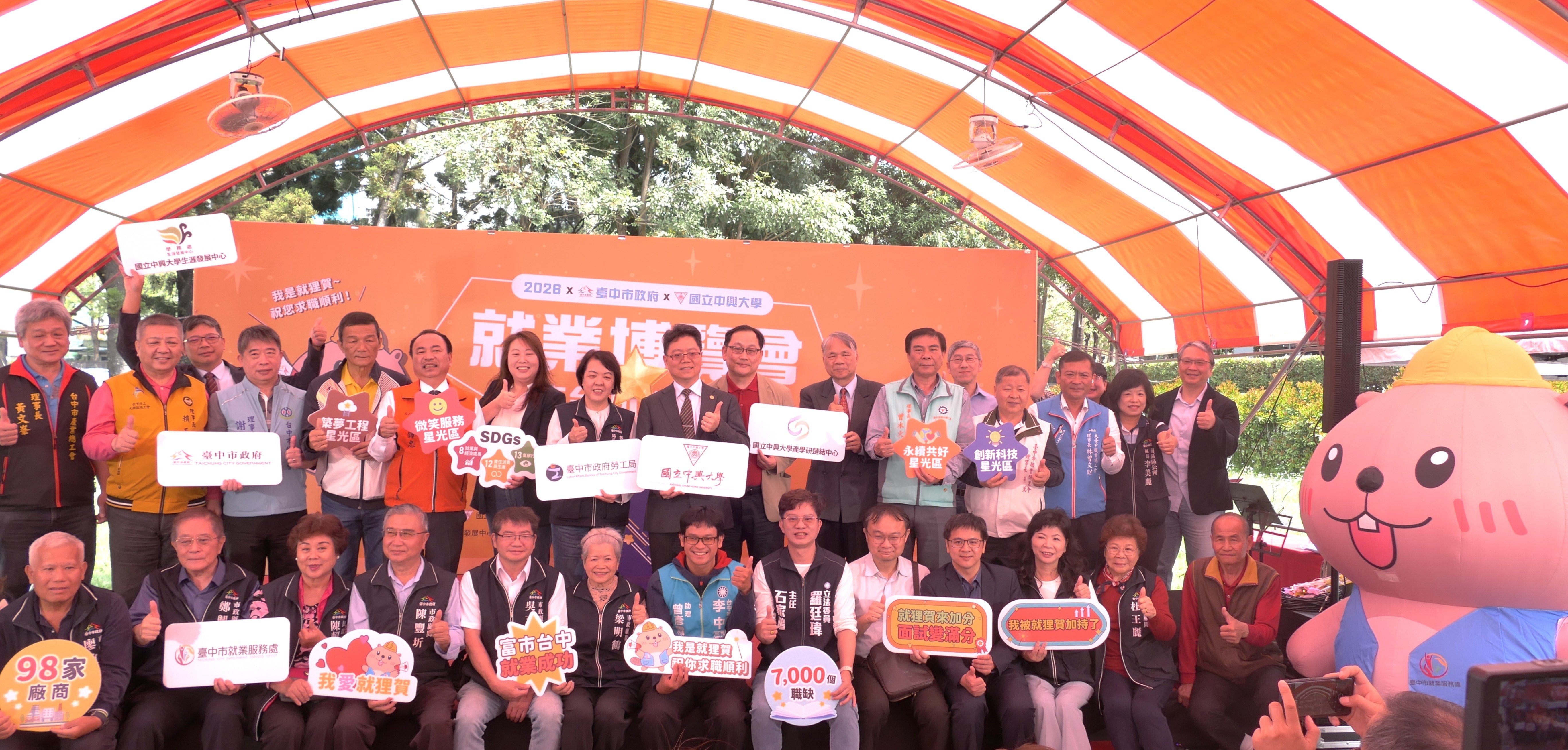 台中市今年上半年最大場「富市台中 就業成功」就業博覽會於今(21)日在中興大學惠蓀堂熱鬧登場。現場設置創新科技星光區、築夢工程星光區、微笑服務星光區、永續共好星光區等4大徵才專區,邀集98家廠商,提供超過7,000個職缺,吸引逾5,000位求職者熱情參與,初步媒合率達6成,其中台積電、台灣美光、鴻海等知名企業面試攤位大排長龍,吸引許多青年學子參與求職熱潮,也讓求才企業找到優質人才!