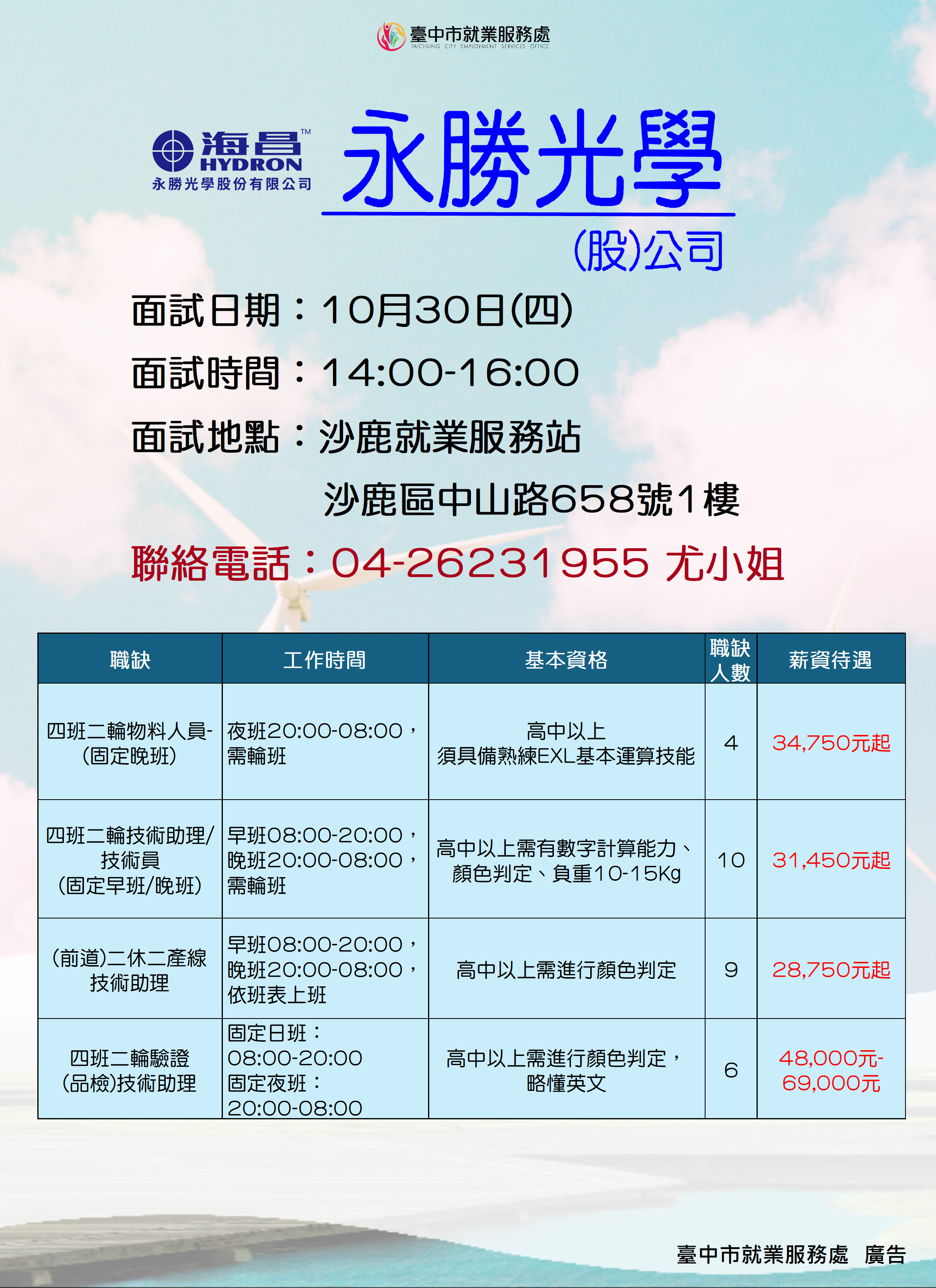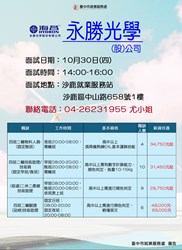 10/30(四)永勝光學股份有限公司單一徵才活動
