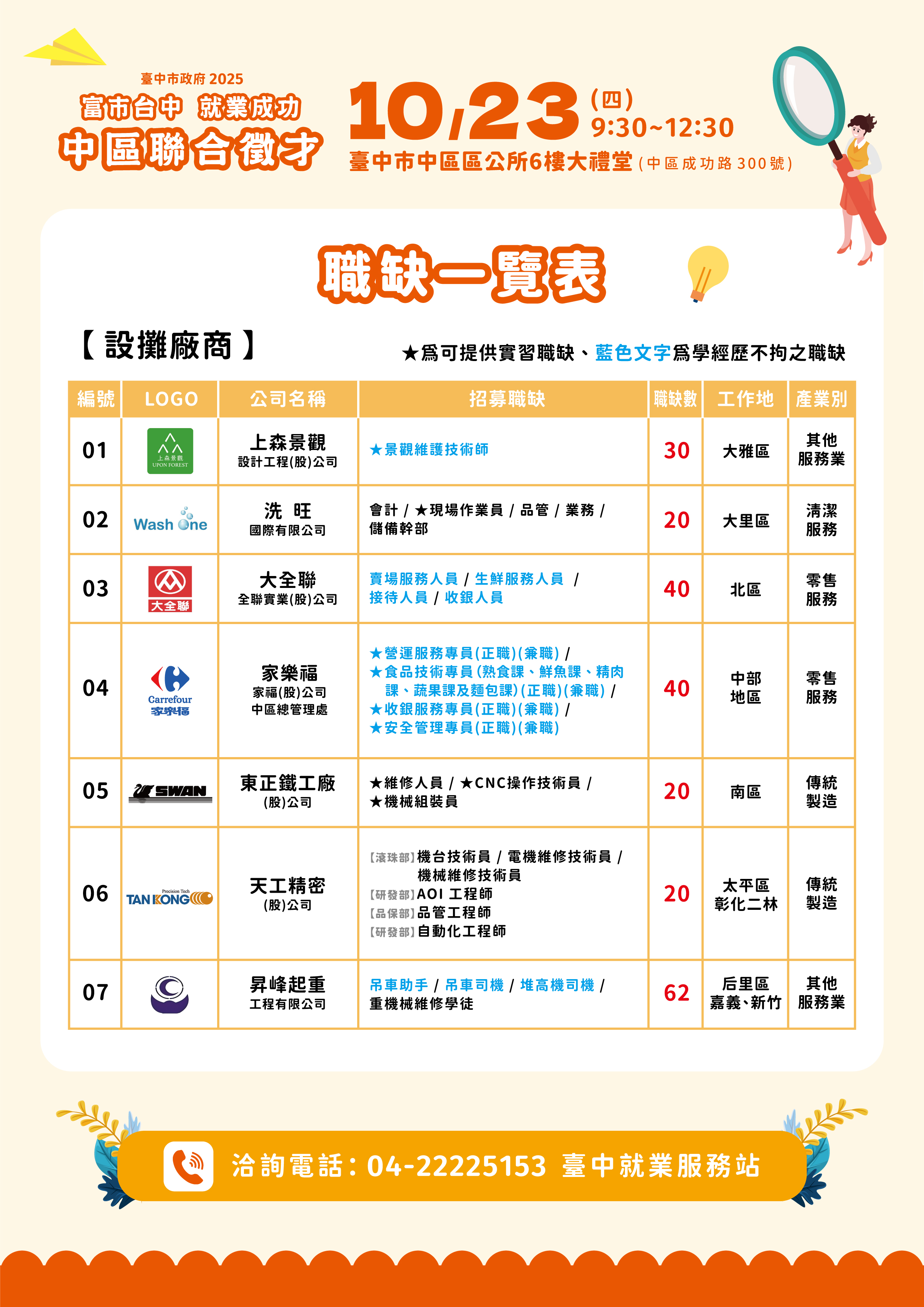 洽詢電話:04-22225153 臺中就業服務站