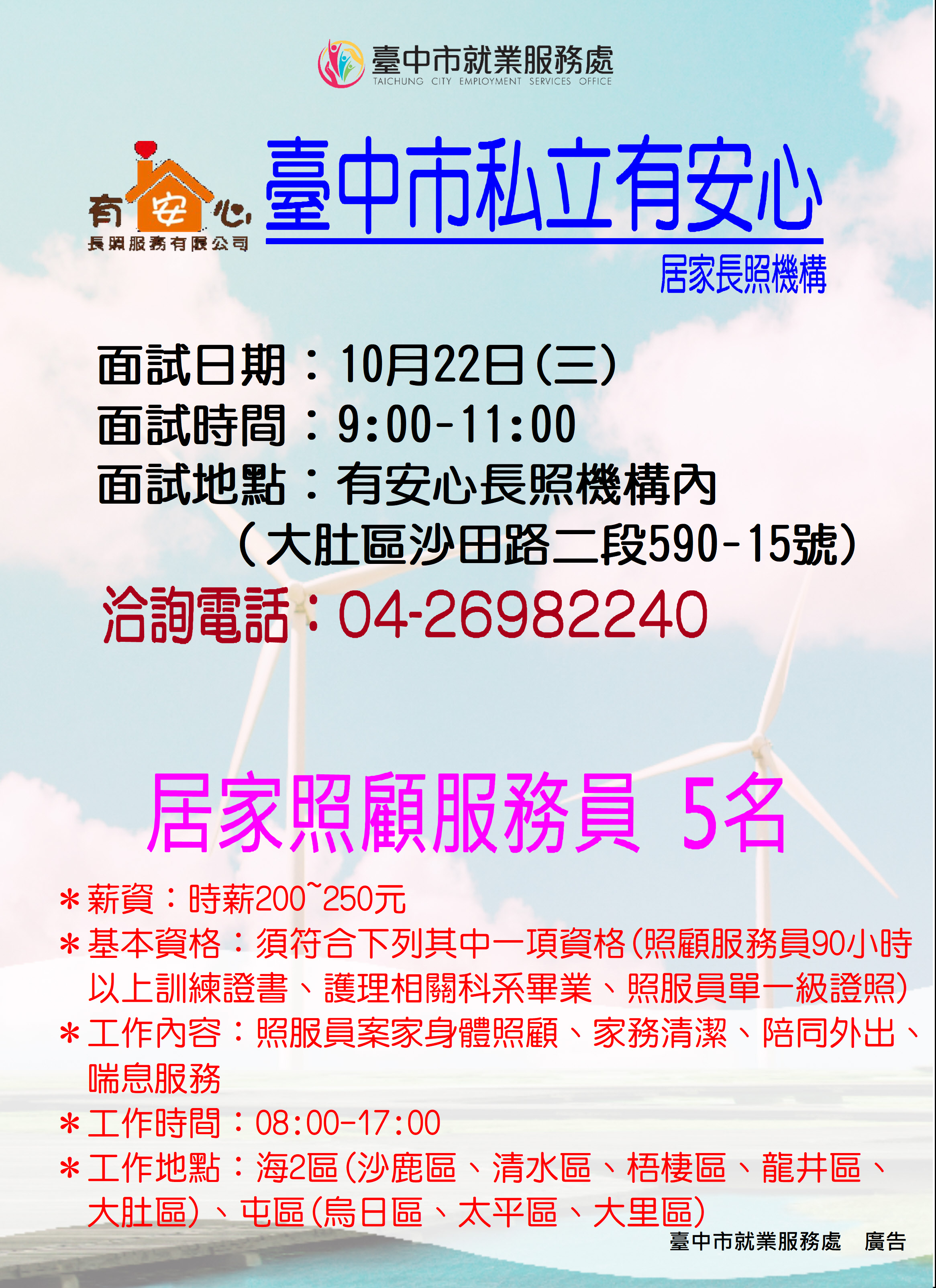 10/22(四)有安心長照服務有限公司臺中市私立有安心居家長照機構單一廠商徵才活動