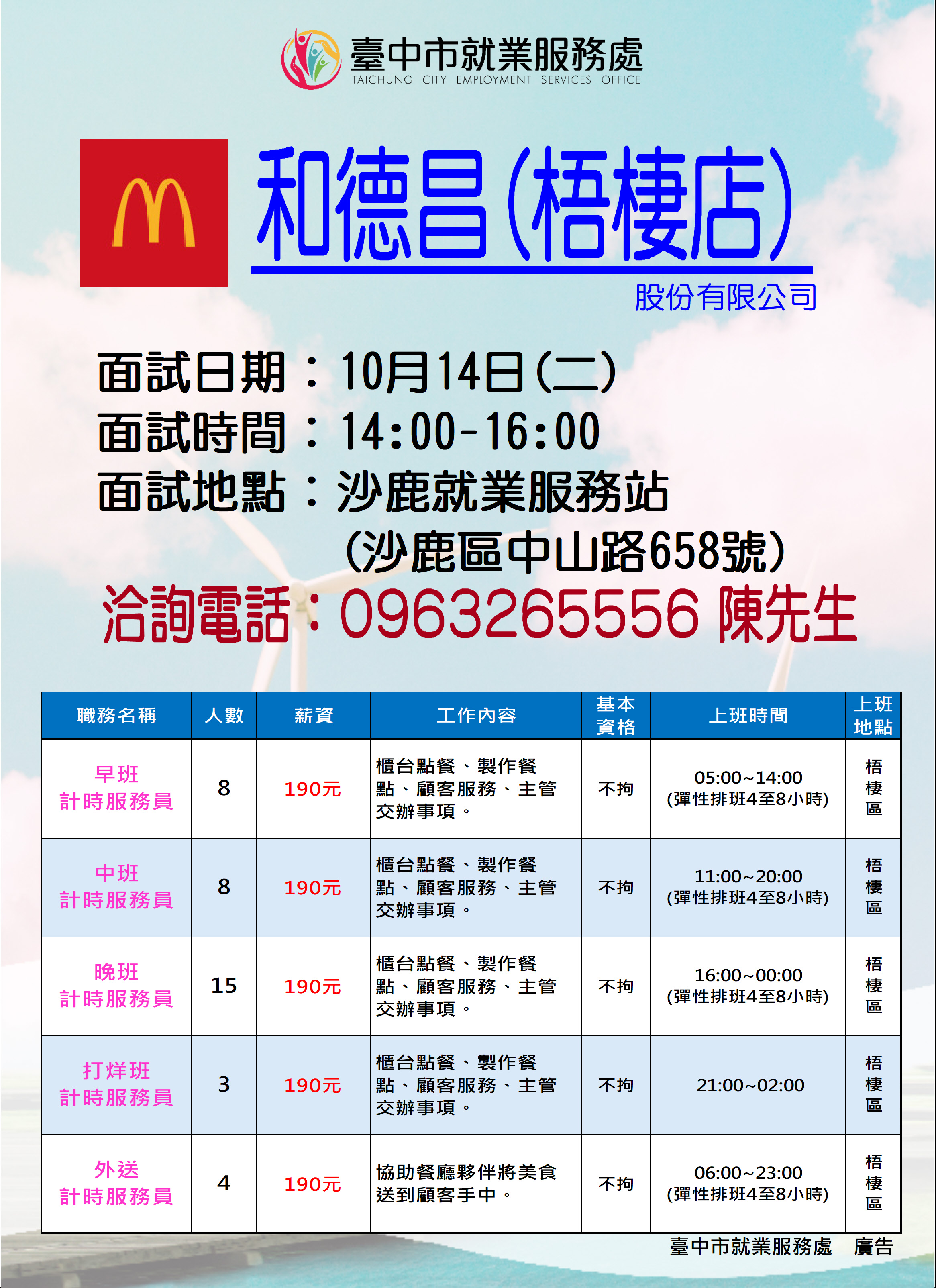 性 質:單一廠商徵才活動 活動日期:10/14(二)14:00-16:00 活動地點:沙鹿就業服務站(沙鹿區中山路658號) 廠商名稱:和德昌股份有限公司 廠商地址:臺中市沙鹿區台灣大道七段333號 工作地點:臺中市梧棲區、沙鹿區 職 缺一:早班計時服務員 (8名) 工作內容:1.櫃台點餐、製作餐點、顧客服務、主管交辦事項 工作時間:5:00~14:00(彈性排班4至8小時) 基本資格:經驗不拘 薪資待遇︰時薪190元 職 缺二:中班計時服務員 (8名) 工作內容:1.櫃台點餐、製作餐點、顧客服務、主管交辦事項 工作時間:11:00~20:00(彈性排班4至8小時) 基本資格:經驗不拘 薪資待遇︰時薪190元 職 缺三:晚班計時服務員 (15名) 工作內容:1.櫃台點餐、製作餐點、顧客服務、主管交辦事項 工作時間:16:00~00:00(彈性排班4至8小時) 基本資格:經驗不拘 薪資待遇︰時薪190元 職 缺四:打烊班計時服務員 (3名) 工作內容:清洗跟整理環境 工作時間:21:00~02:00 基本資格:經驗不拘 薪資待遇︰時薪190元(00:00後時薪245元) 職 缺五:外送計時服務員 (4名) 工作內容:協助餐廳夥伴將美食送到顧客手中 工作時間:06:00~23:00(彈性排班4至8小時) 基本資格:經驗不拘 薪資待遇︰時薪190元 |