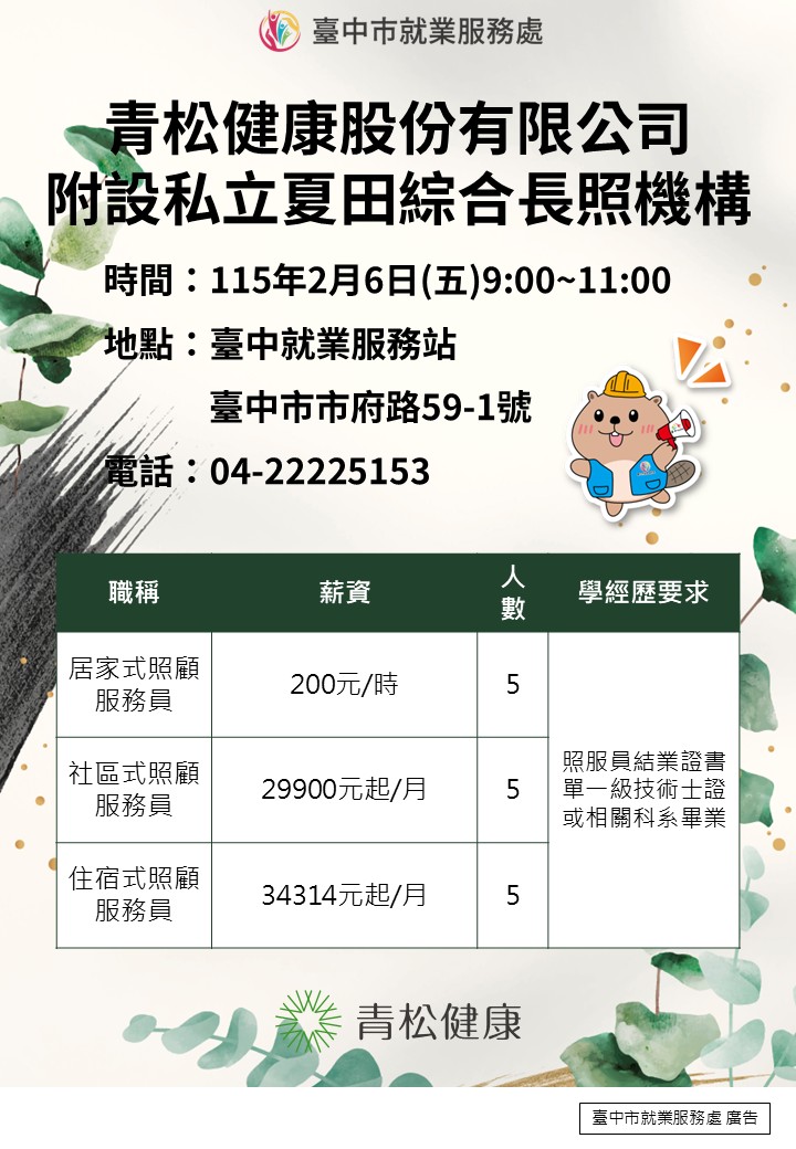02/06(五)青松健康股份有限公司附設私立夏田綜合長照機構單一徵才