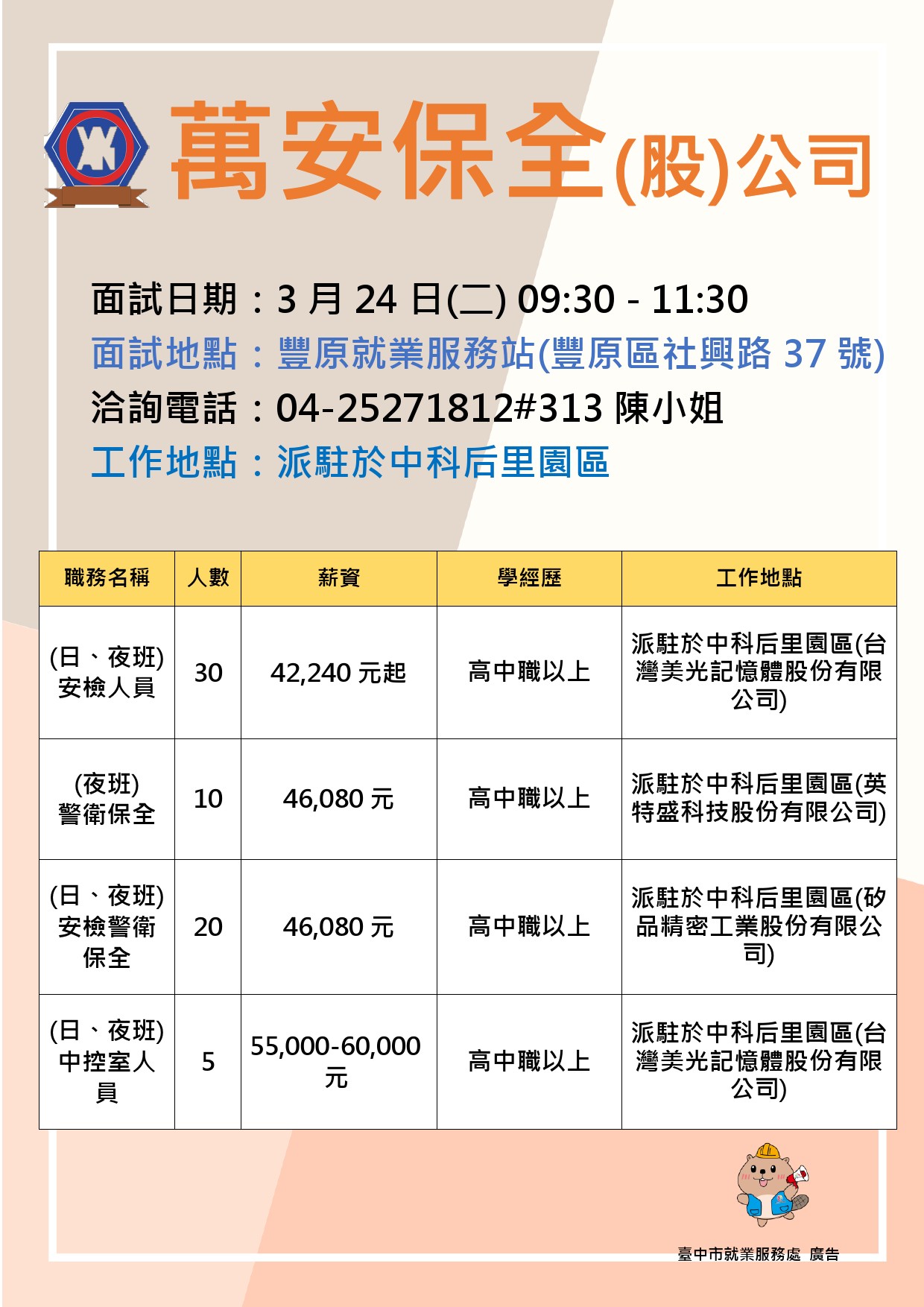 🔎職缺三:(日、夜班)安全警衛保全(月薪制/20名)