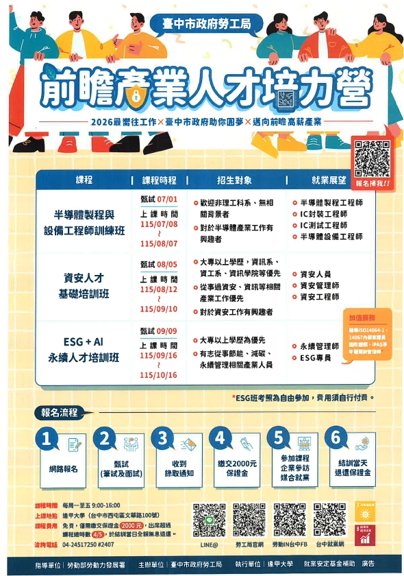 一.目的:為促進本市勞動人力升級,因應新興產業之人力需求,前瞻性透過系列性培力機制為產業量身打造相對應之人才能力,以新興產業為範疇,協助民眾跨領域學習產業專業技能,具備進入前瞻產業之基礎能力,透過小班制、專業化的技能培力工作坊,增強初入或重返職場者所需能力,協助求職者逐步穩定就業,提升本市勞動參與率。