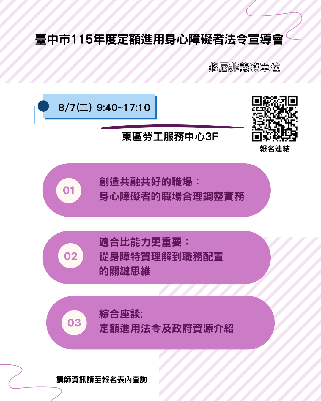 加強事業單位了解進用身心障礙者之相關規定,每年度舉辦定額進用宣導會,歡迎對於本議題有興趣的單位踴躍報名。