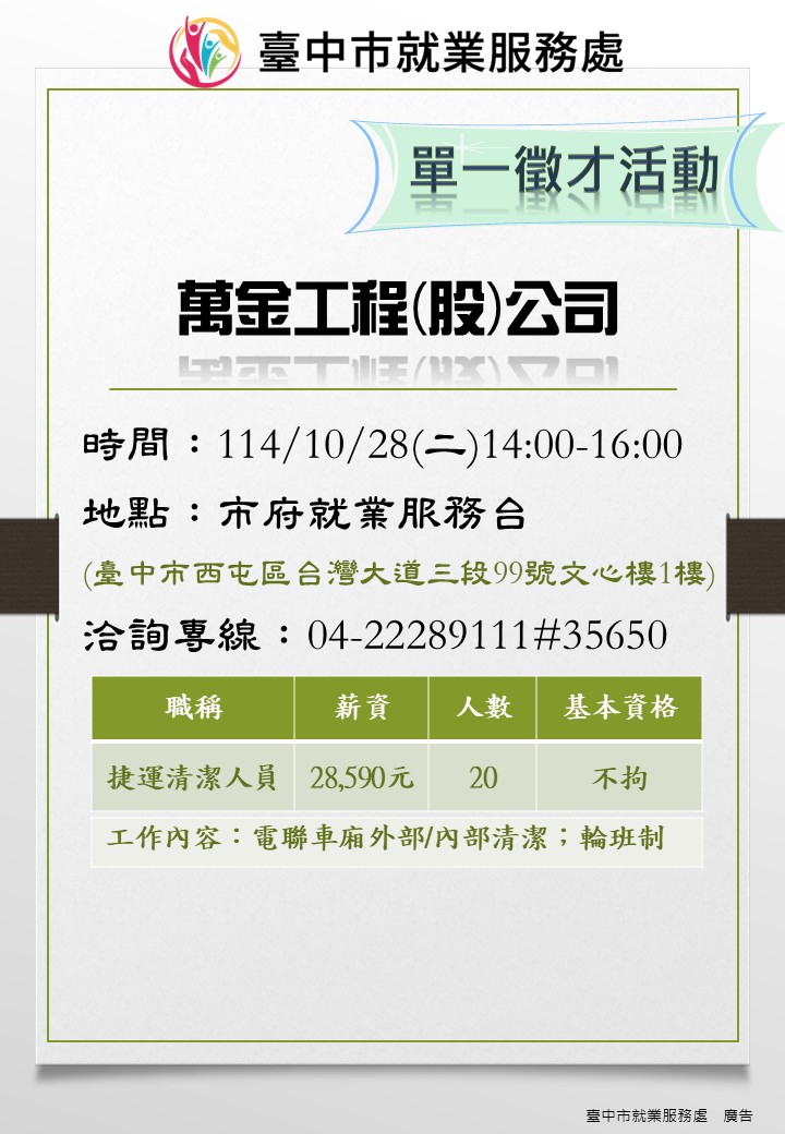 10/28 ( 二 ) 萬金工程股份有限公司廠商單一徵才