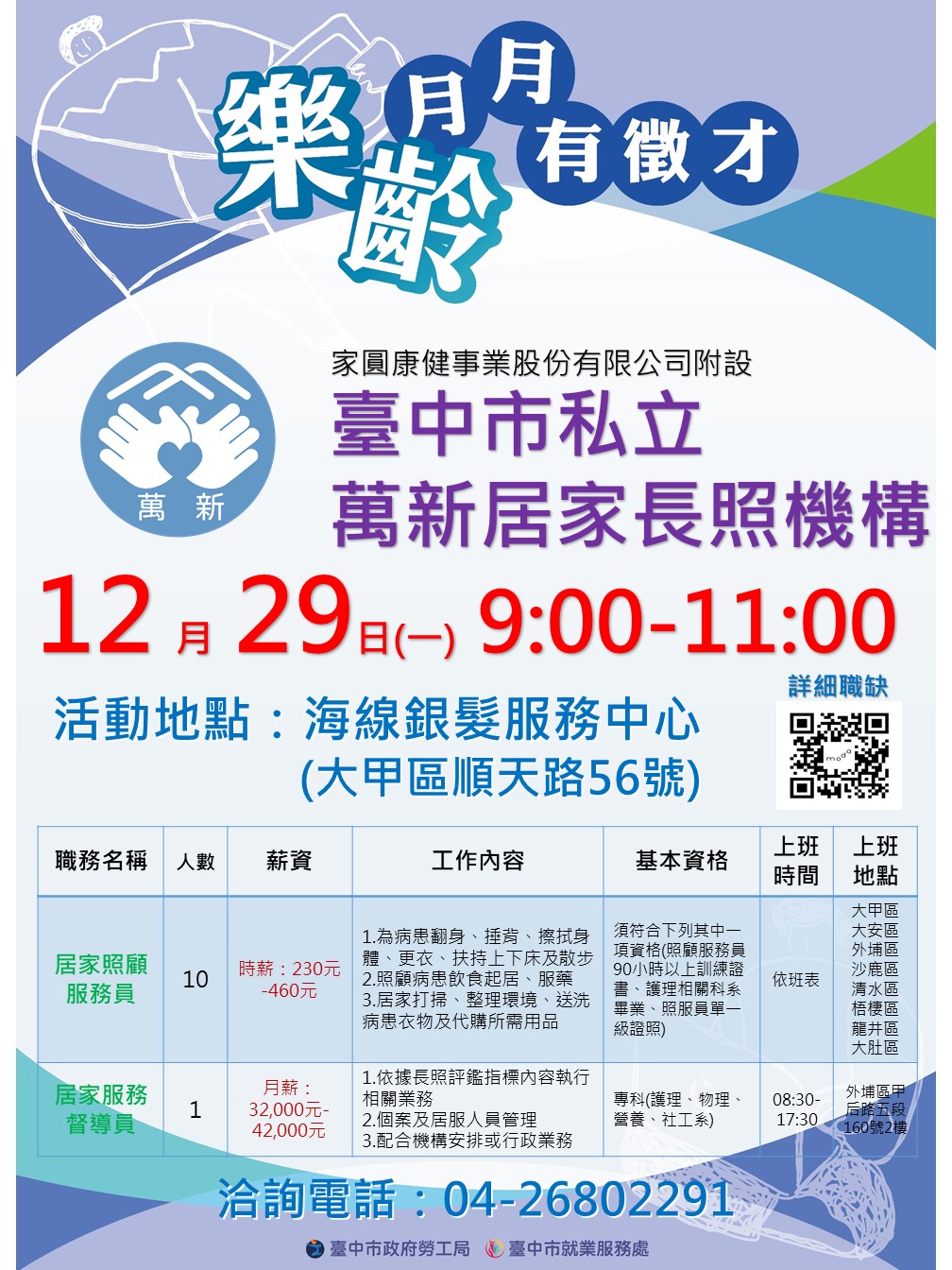 12/29(一)臺中市政府2025「富市台中就業成功」樂齡就業 月月有徵才