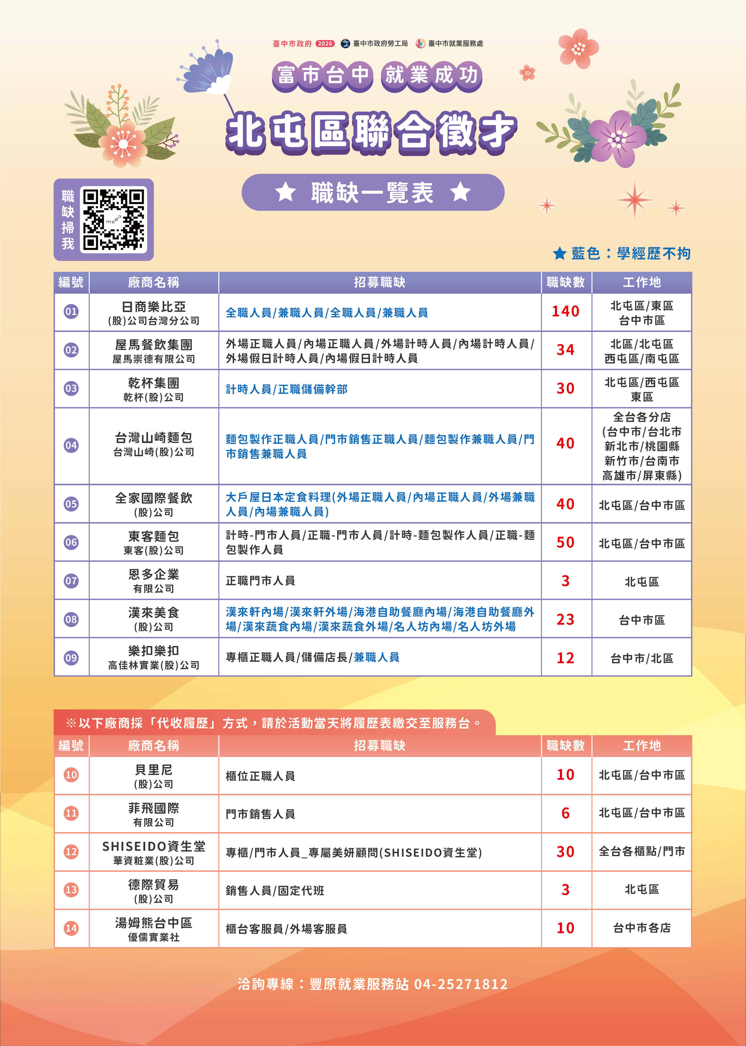 邀請日商樂比亞、東客麵包、台灣山崎麵包及乾杯集團等14家廠商,提供超過400個工作機會,歡迎市民朋友踴躍參加。