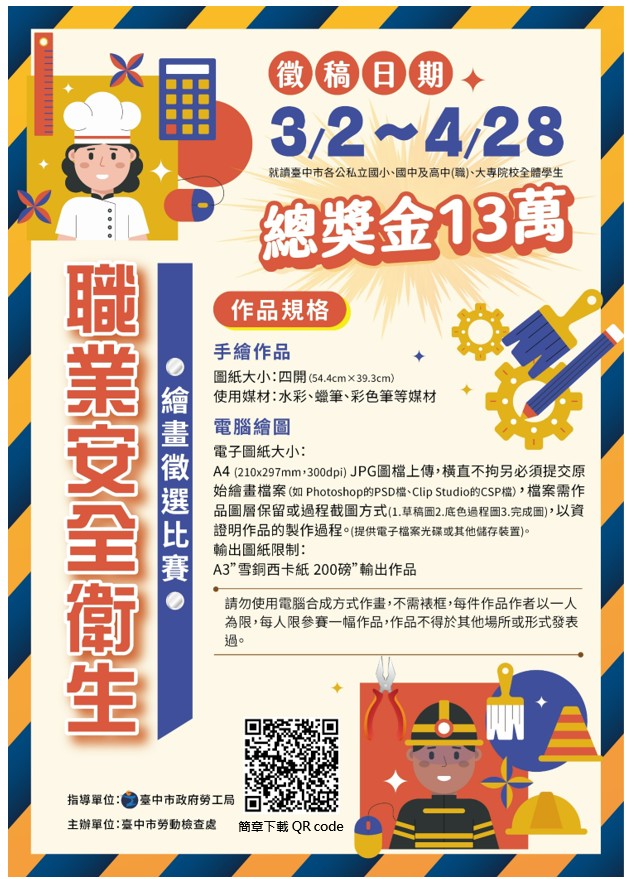 勞工局表示,這次競賽除延續國小及國中手繪組外,持續辦理電腦繪圖組,鼓勵學生運用數位工具,以創新表現手法呈現職場作業安全、環境衛生及健康促進等議題。此次徵稿期間自3月2日起至4月28日17時止,歡迎台中市各公私立國小、國中、高中職及大專院校學生踴躍投稿參加,透過多元媒材與創作形式,讓職業安全衛生理念在校園向下扎根。
