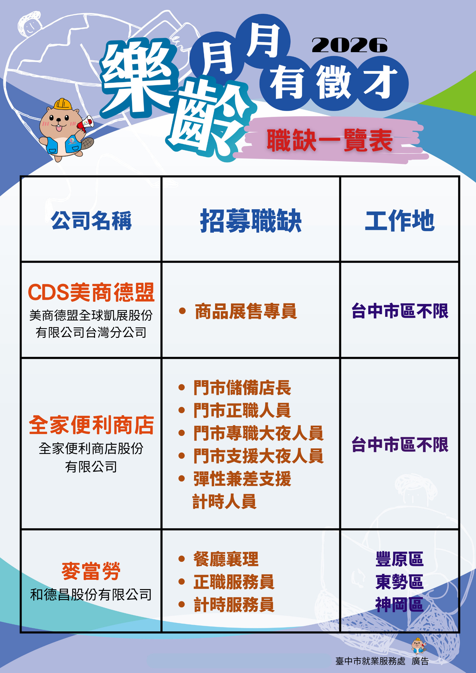 ★邀請CDS美商德盟、麥當勞及全家便利商店共3家企業,提供103個職缺,歡迎求職民眾踴躍參加。