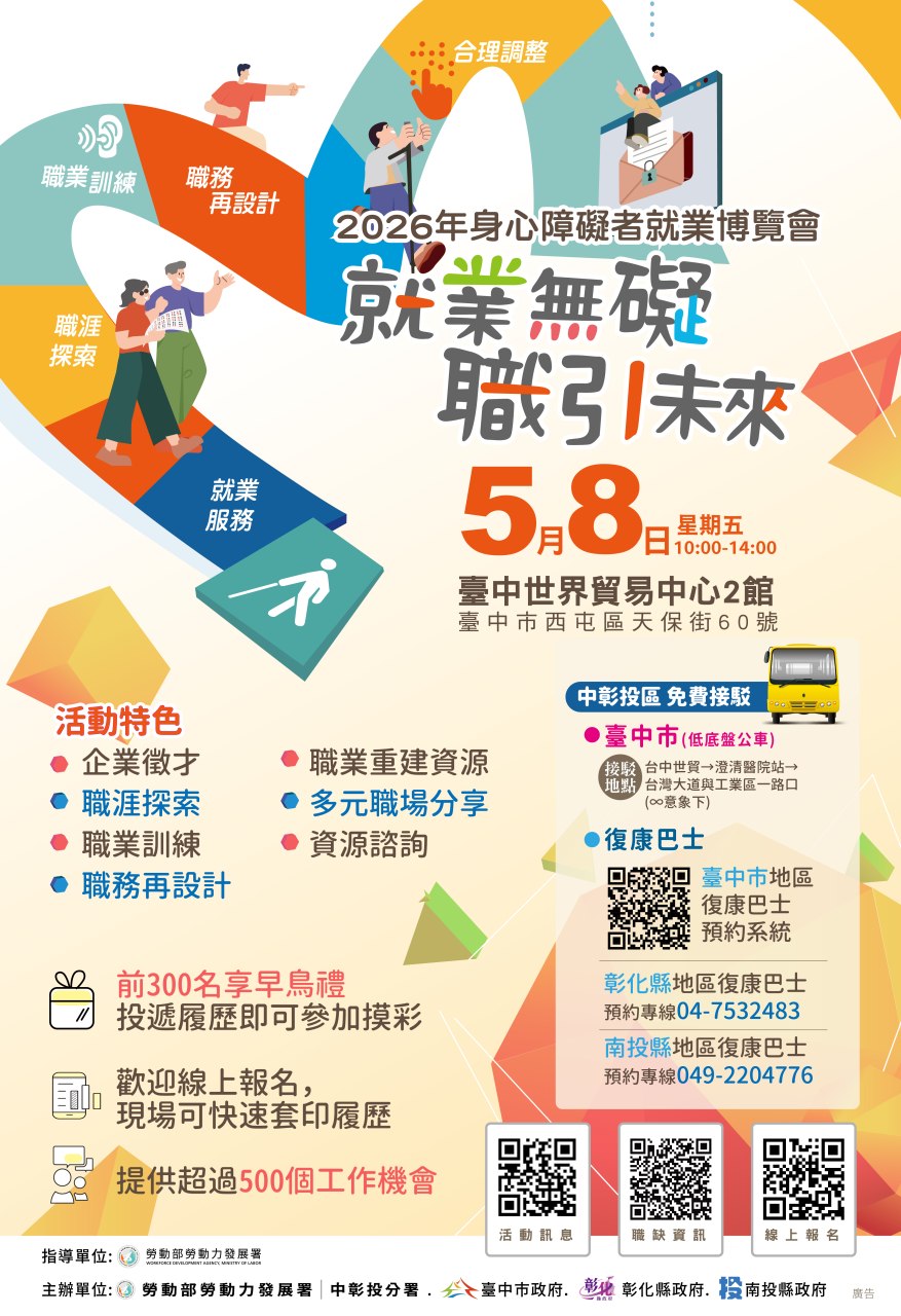 勞動部勞動力發展署中彰投分署與轄內臺中市、彰化縣及南投縣等3縣市政府即將在今(115)年的5月8日(星期五)上午10時至下午2時,在臺中世界貿易中心2館共同為身心障礙朋友舉辦「就業無礙 職引未來-2026年身心障礙者就業博覽會」。