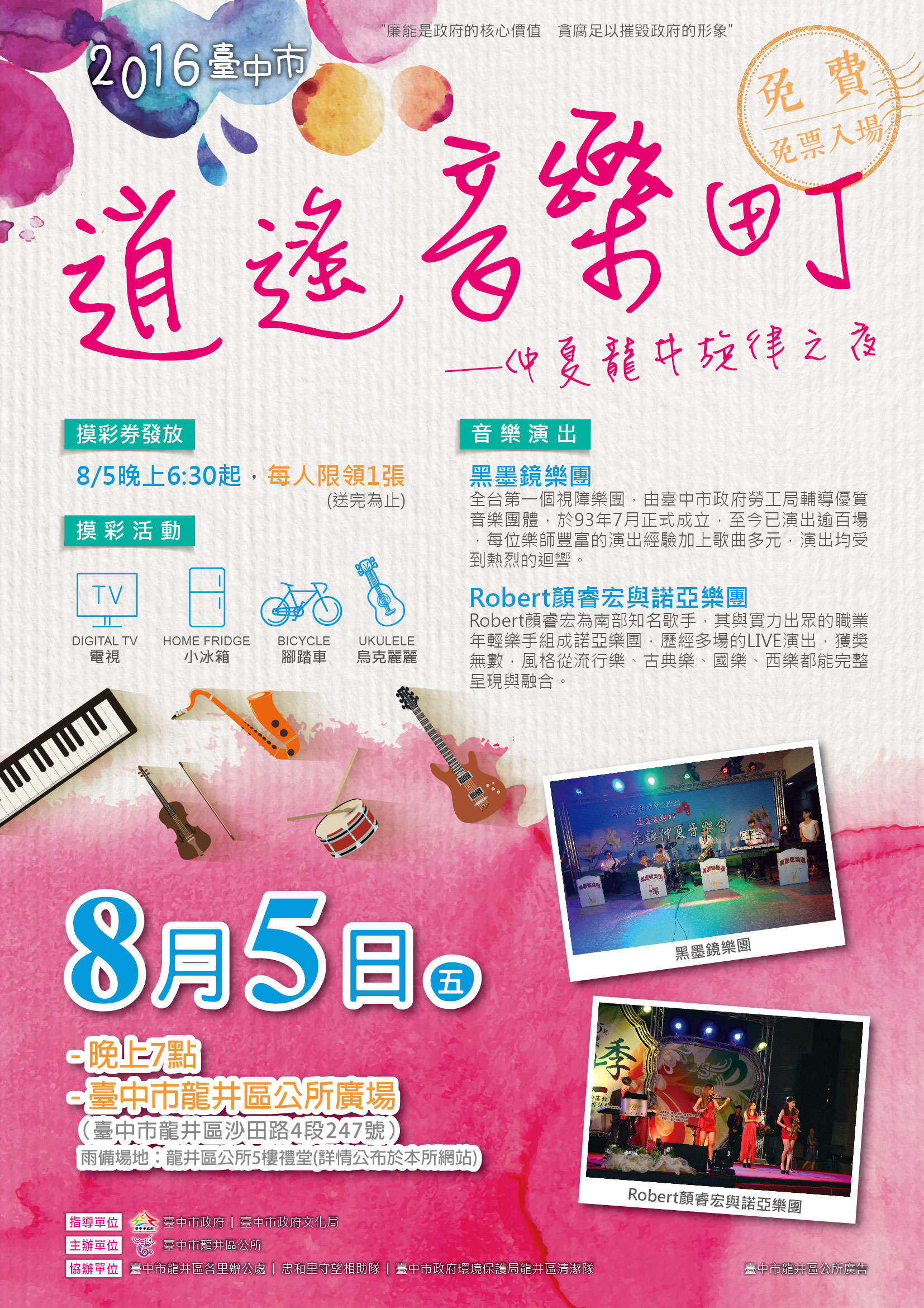 「2016臺中市逍遙音樂町─仲夏龍井旋律之夜」,請踴躍參加!