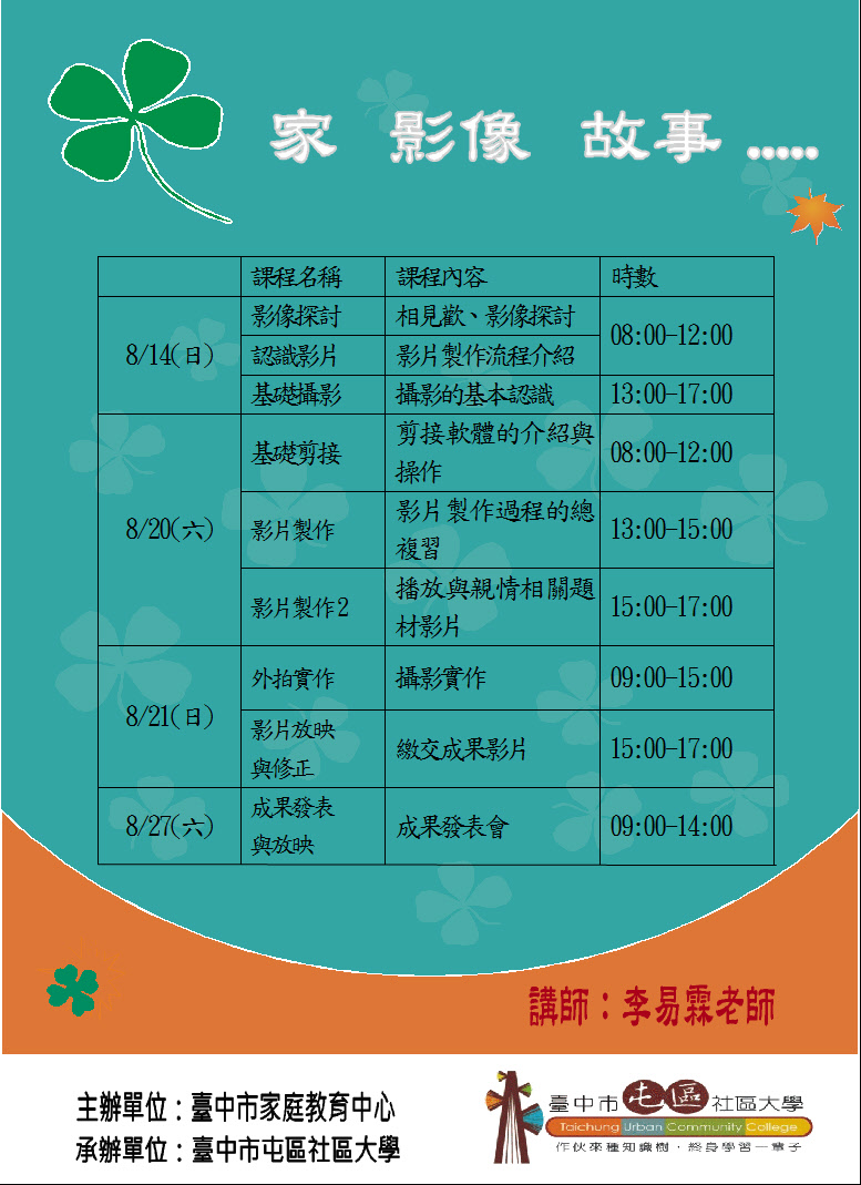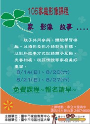 臺中市家庭教育中心辦理8月14日及8月27日「家庭影像故事~影片製作及剪輯」活動,請貴單位惠予協助公告及跑馬燈宣傳。