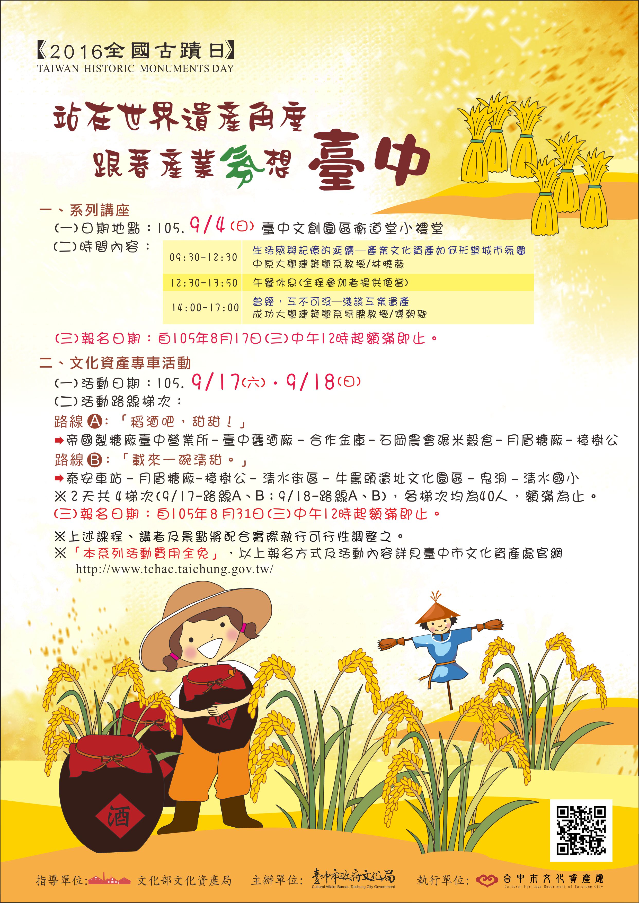 臺中市文化資產處配合文化部文化資產局「2016全國古蹟日」,訂於本(105)年9月4日、17日及18日辦理臺中市全國古蹟日活動,詳細活動內容及報名方式請上臺中市文化資產處官網活動訊息(http://www.tchac.taichung.gov.tw)查訊。