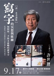 一、旨揭講座訂於本(105)年9月17日(六)舉辦,將邀請符號藝術家許世賢分享「寫字的冥想與修練-如何寫一手快又流暢的硬筆字」。老師將以互動的方式,帶領大家臨摹書寫詩集,藉此習得正確的寫字方法,並領略詩歌美妙之處。二、時間:105年9月17日(六)上午10時至12時。三、地點:臺中市立圖書館南屯分館3樓會議室(臺中市南屯區大墩十二街361號)。四、公教人員全程參與者核予終身學習時數2小時。五、檢附本講座文宣乙份。 聯絡人:曾敬傑 聯絡電話:0424225101#507