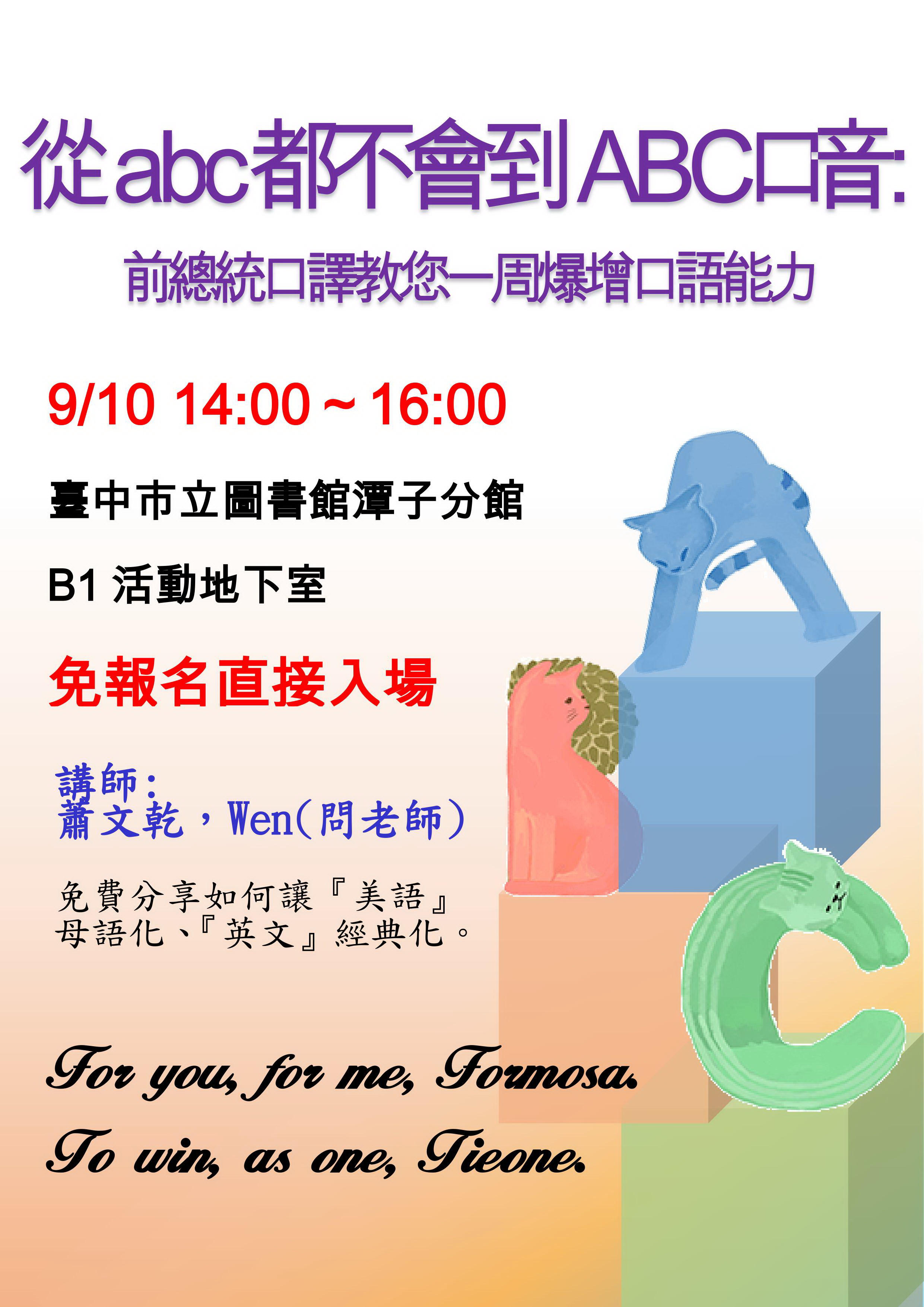 臺中市立圖書館訂於本(105)年9月10日(六)於本館潭子分館舉辦「從abc都不會到ABC口音」英語教學講座