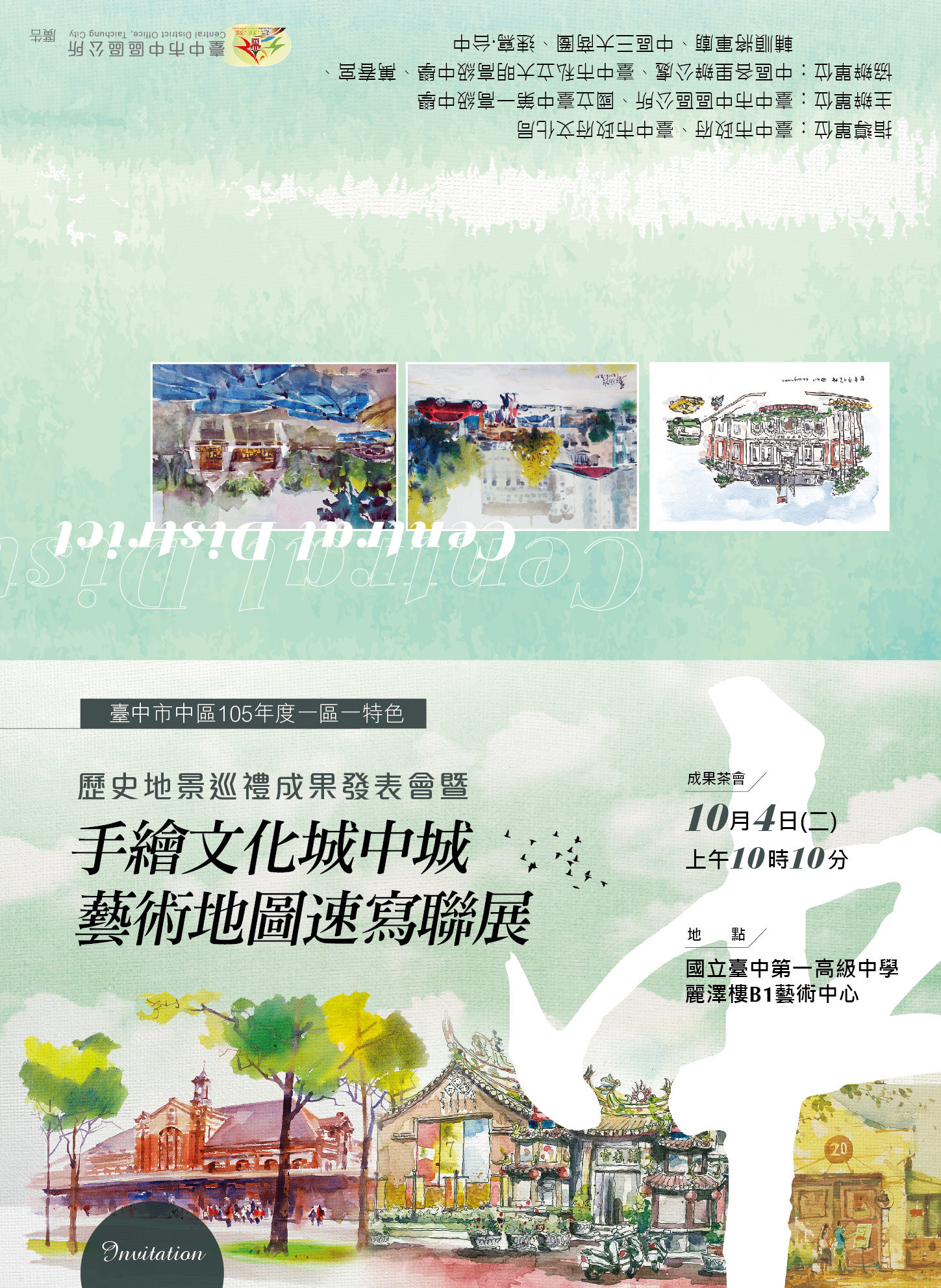 臺中市中區105年度一區一特色歷史地景巡禮成果發表會暨手繪文化城中城藝術地圖速寫聯展,自105年9月19日起於國立臺中一中及中區公所展出,邀您一起共襄盛舉!