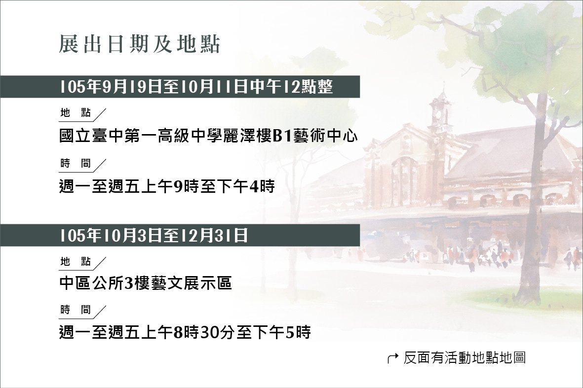 臺中市中區105年度一區一特色歷史地景巡禮成果發表會暨手繪文化城中城藝術地圖速寫聯展,將於本(105年)9月19日起進行,本聯展共分為2處展場,分別於國立臺中第一高級中學麗澤樓B1藝術中心(105年9月19日起至10月11日中午止)與本所3樓藝文展示區(105年10月3日起至12月31日止)辦理,並訂於本(105)年10月4日上午10時起假臺中一中藝術中心舉行成果茶會,歡迎蒞臨參觀。
