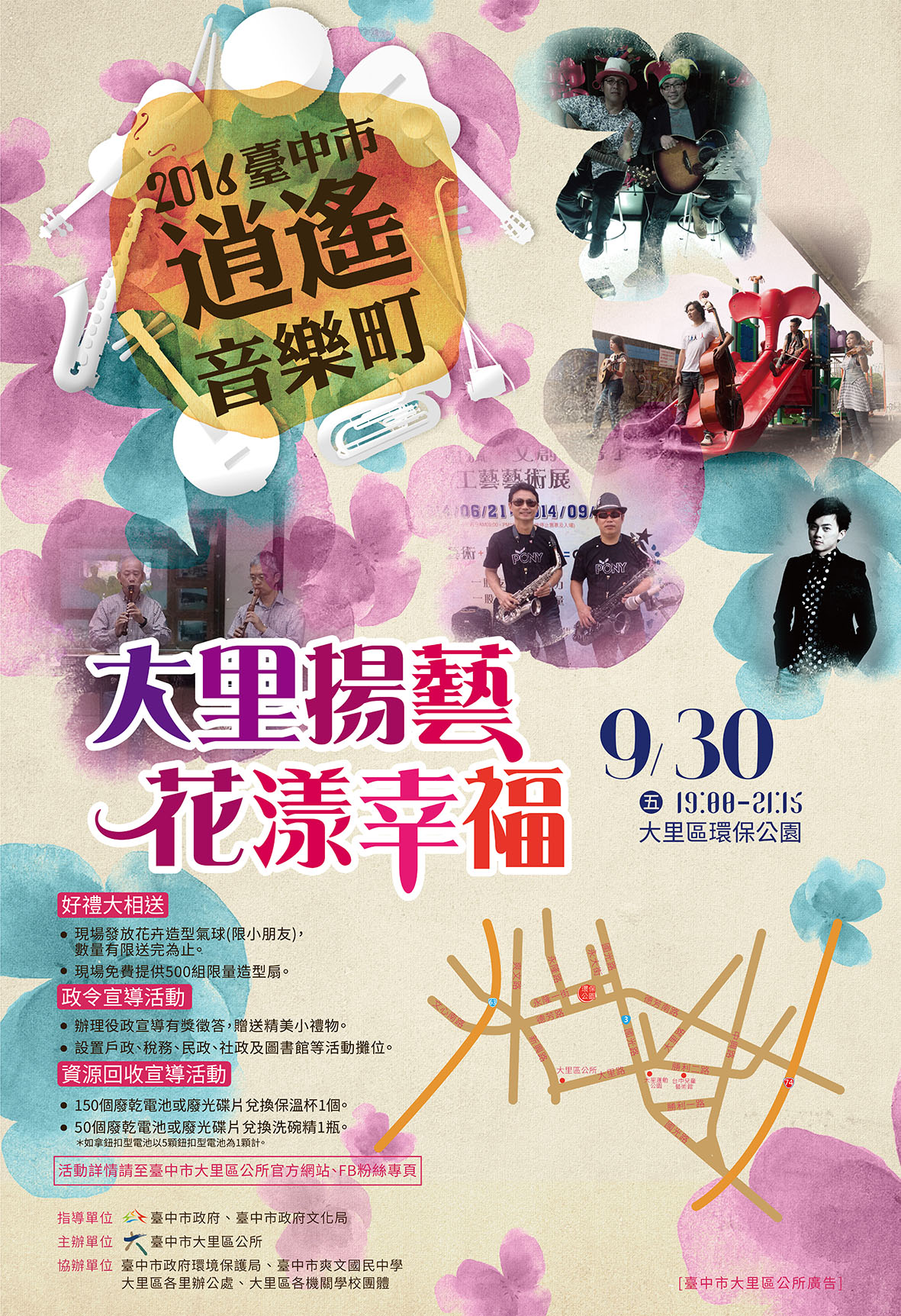 一、依據臺中市大里區公所105年9月20日里區文字第1050026959號函辦理。二、活動時間:105年9月30日(星期五)下午7時。三、活動地點:大里區環保公園(臺中市大里區永隆一街與永大街口)。四、活動當日邀請原木二人組、VIVA BAND、直笛二人組、大新薩克斯風樂團熱情演出及魔術師詹澤程表演精湛魔術,歡迎踴躍參加。五、活動進行中辦理役政宣導有獎徵答,現場設置戶政、民政、稅務及資源回收宣導等活動攤位。六、檢附活動相關文宣電子檔1份。 聯絡人:林先生 聯絡電話:04-24063979#553