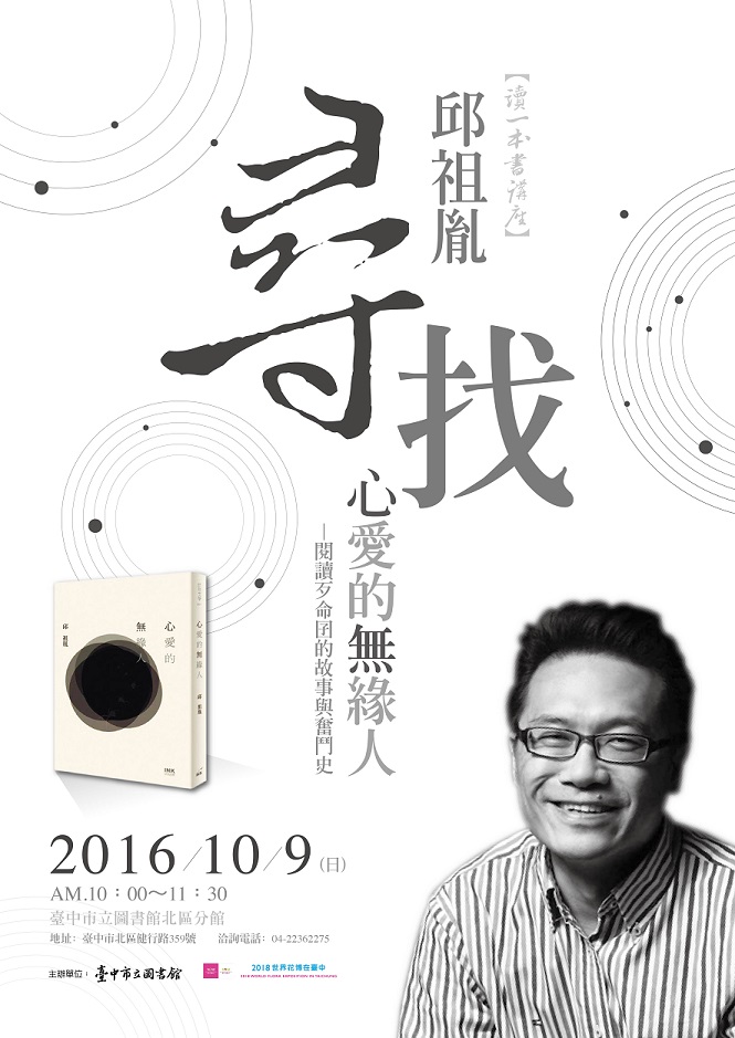 一、講座邀請作家邱祖胤分享「尋找心愛的無緣人-閱讀歹命囝的故事與奮鬥史」,帶領讀者體驗台灣的鄉土味,認識早期臺灣女性的堅韌生命力。