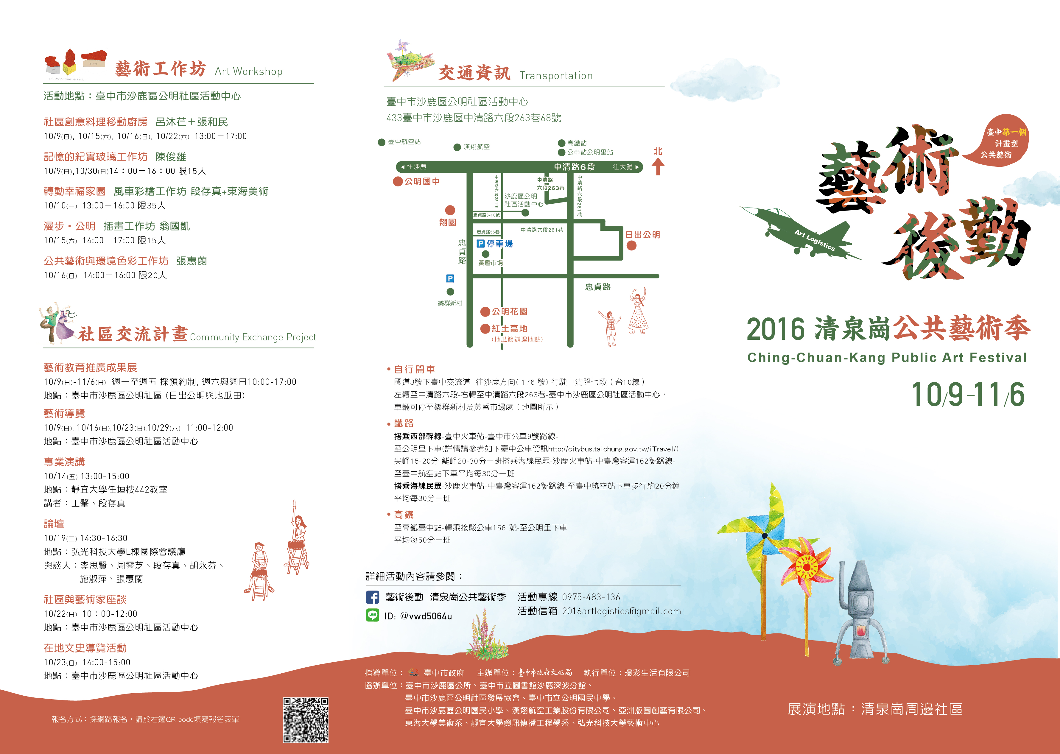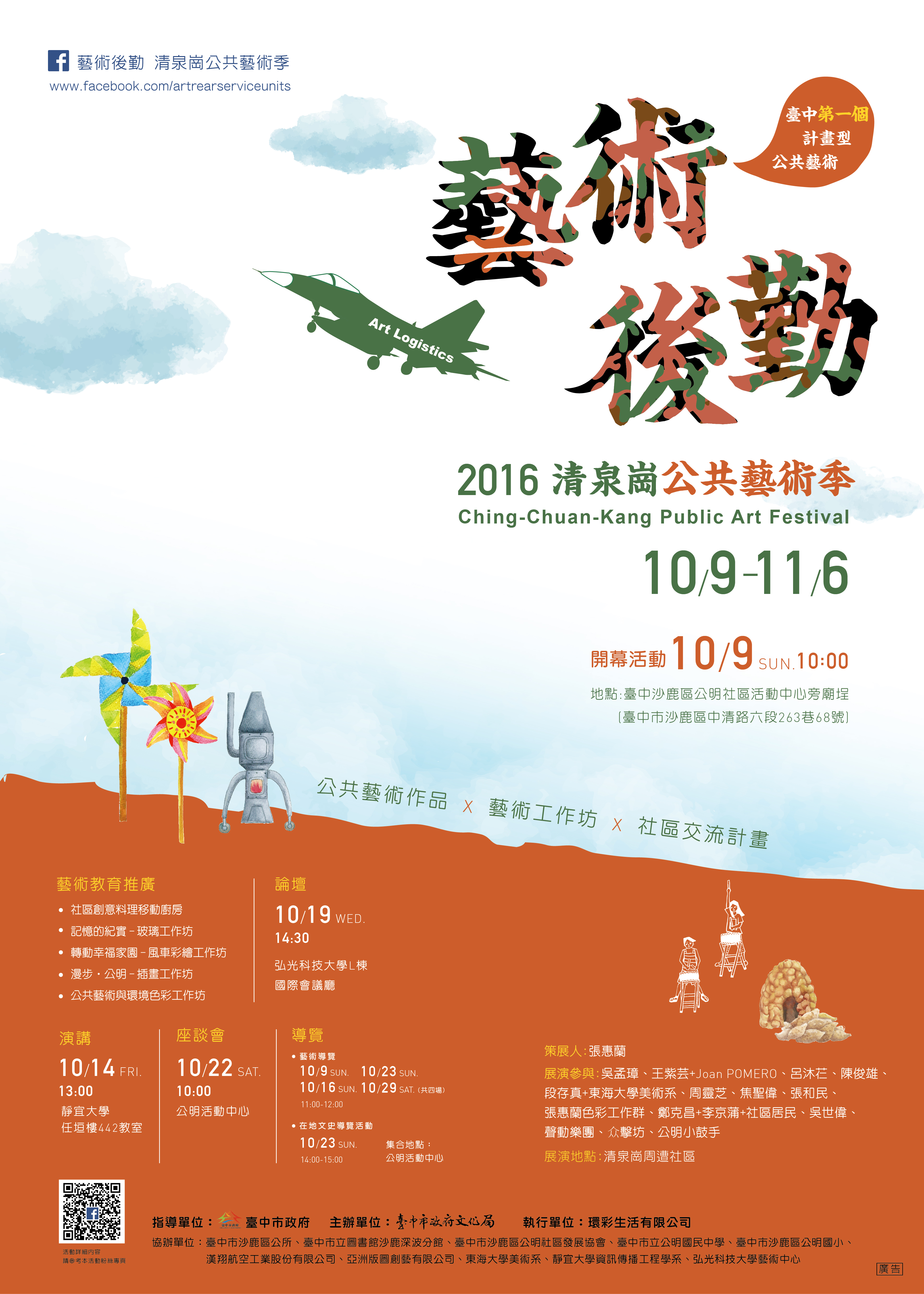 「藝術後勤 2016清泉崗公共藝術季」將於本(105)年10月9日起至11月6日起舉辦,惠請協助宣傳活動訊息,請查照!