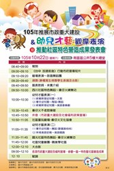 二、本活動為推展市政重大建設結合幼兒才藝觀摩表演並與本(105)年執行一區一特色及各社造點推動社區營造等工作共同辦理聯合成果展,使市政宣導及社區營造活動兼具動態與靜態感,吸引民眾全家大小共同參與。