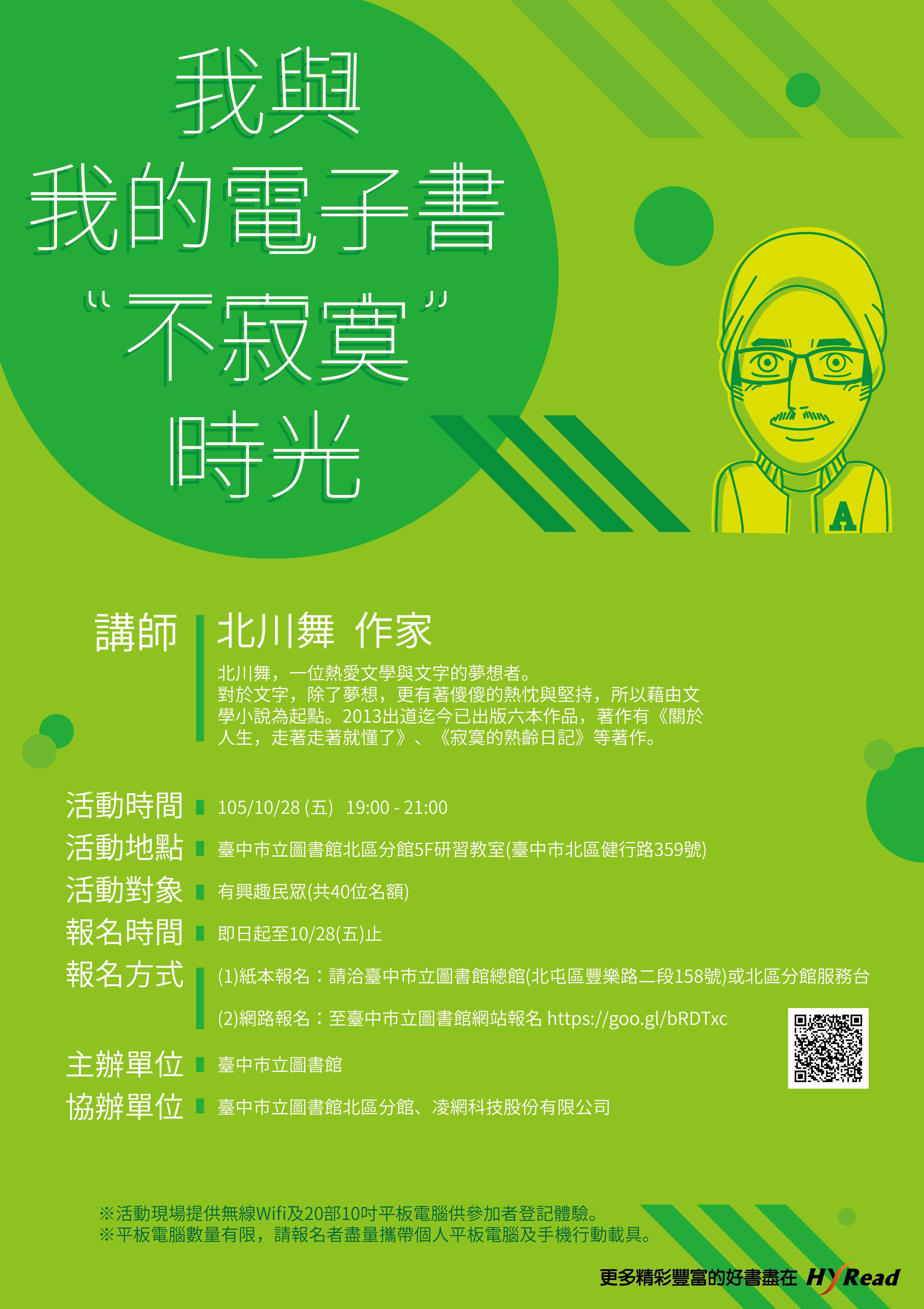 一、本講座邀請出道迄今已出版六本作品,首作一出版即榮登「誠品網路暢銷榜第一名」、「金石堂即時暢銷榜第一名」、「博客來暢銷榜第二名」佳績的知名作家北川舞老師主講,並以其作品「寂寞的熟齡日記」進行電子書導讀,讓市民及讀者體驗真實與網路虛實間不同感受,並認識圖書館豐富的電子書資源。