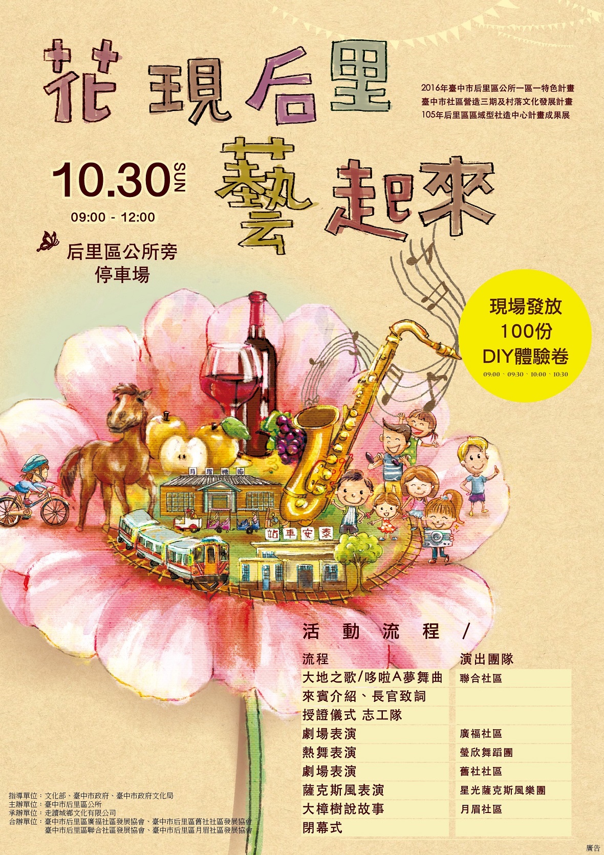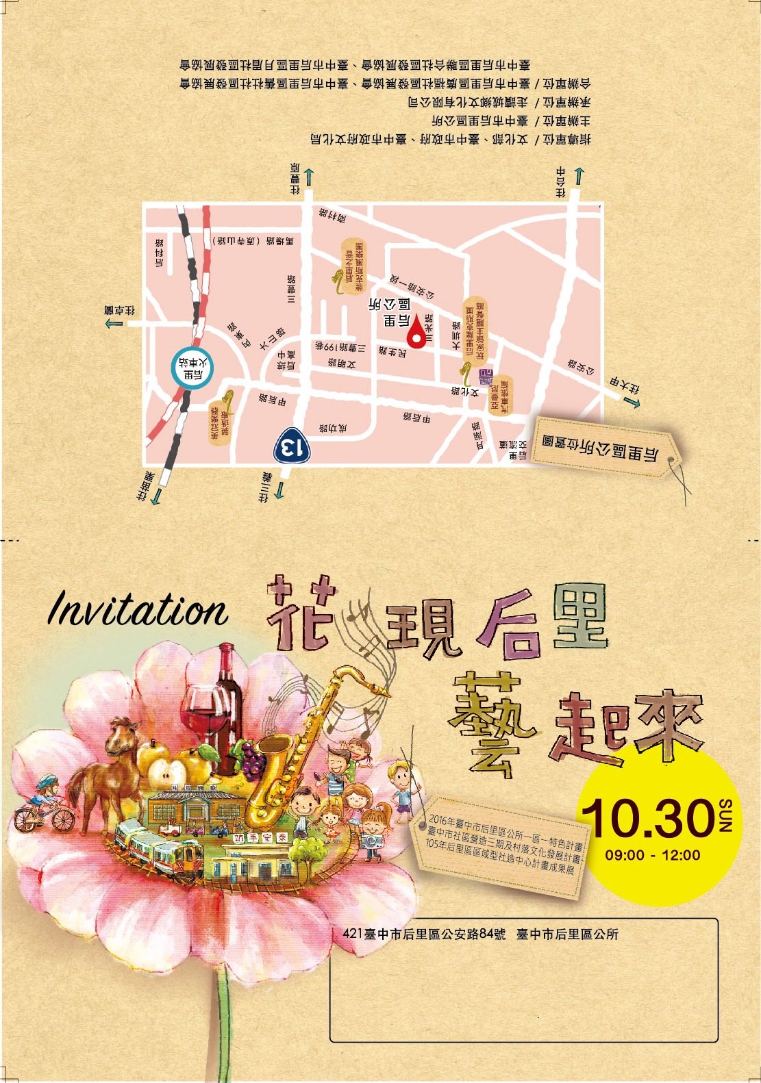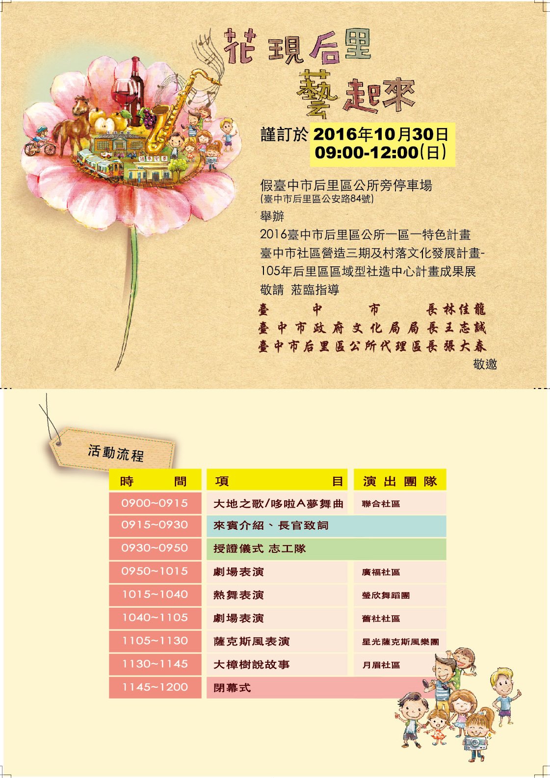 臺中市后里區公所訂於105年10月30日(星期日)假本所旁停車場辦理10年度一區一特色「迎向花博蹲馬步~2016資源盤點、遊程5規劃計畫『花現后里藝起來』」及「臺中市社區營造三期及村落文化發展計畫-105年后里區區域型社造中心計畫」成果展活動,敬請蒞臨指導並協助宣傳,請查照。