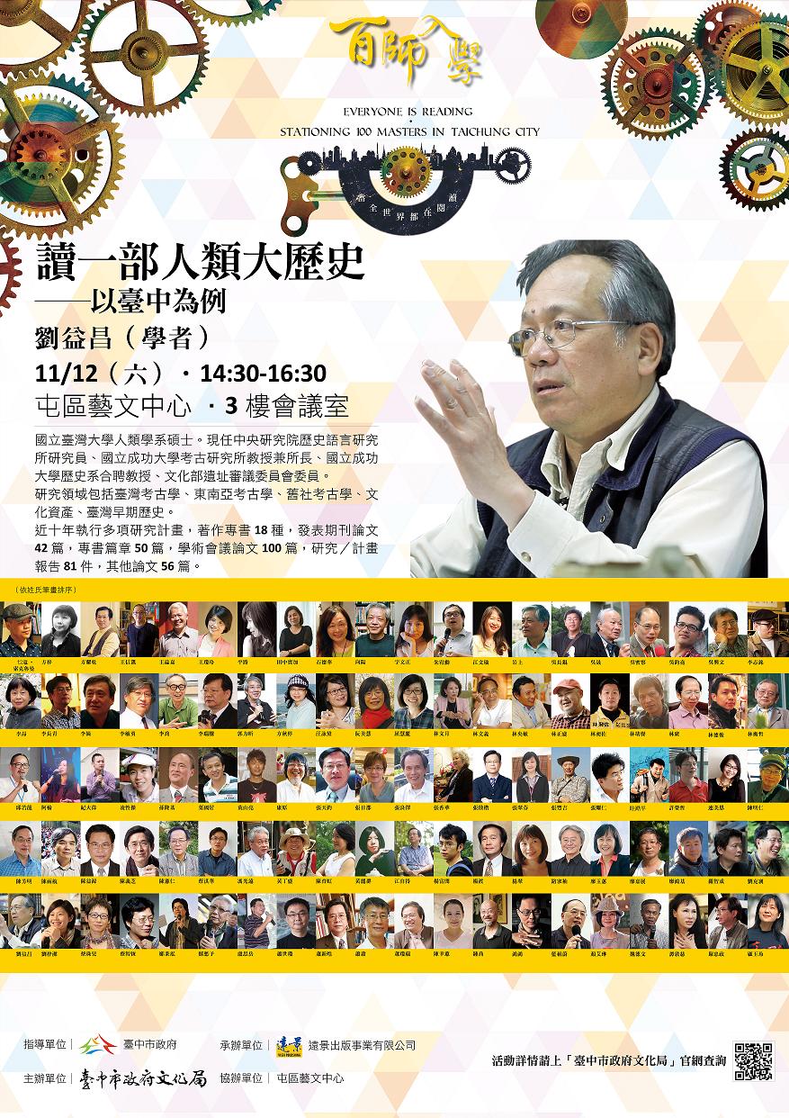 二、「百師入學:10-11月秋季講堂」講座,11月邀請知名學者成功大學考古學研究所所長劉益昌主講:「讀一部人類大歷史—以臺中為例」。歡迎聆賞!詳情可查詢百師入學官網:http://100masters.tw/。