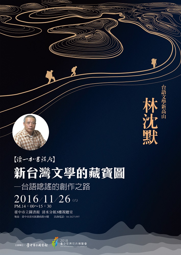 臺中市立圖書館辦理「讀一本書講座」邀請台語詩人林沈默分享「新台灣文學的藏寶圖—台語唸謠的創作之路」,帶領讀者透過唸謠認識自己的家鄉與文化。一、時間:105年11月26日(六)下午2時至3時30分。二、地點:本館清水分館(臺中市清水區鎮政路50號)。 聯絡人:曾敬傑 聯絡電話:0424225101#507