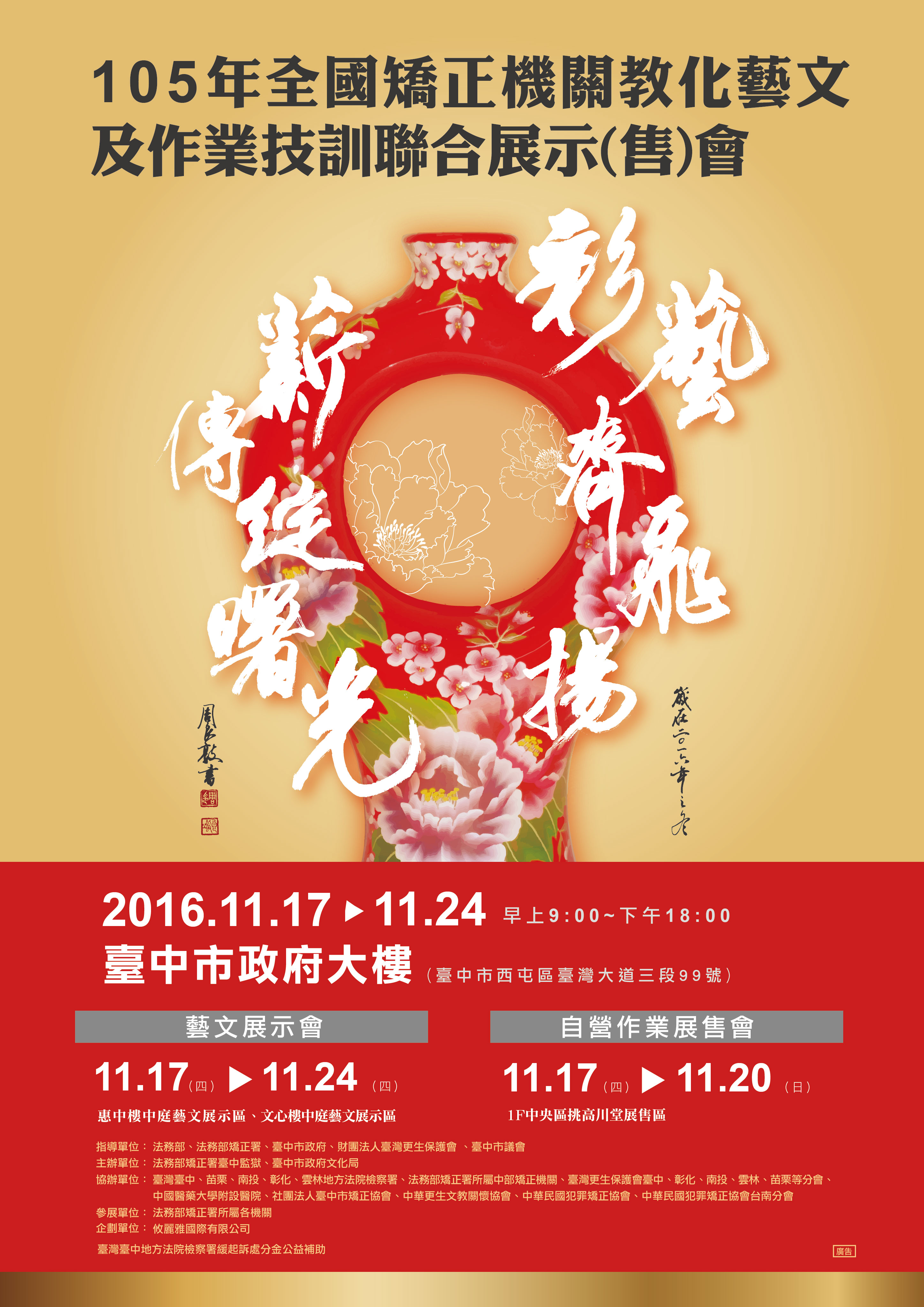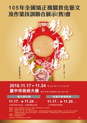 法務部矯正署臺中監獄即日起至11月24日(四)在臺灣大道市政大樓文心樓、惠中樓1樓中庭辦理「105年全國矯正機關教化藝文及作業技訓聯合展示會」活動,敬請踴躍參觀!