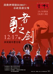 二、敬請協助於貴單位網站暨跑馬燈宣傳,本案之宣傳文案為:「千騎擁高牙,乘醉聽簫鼓~優人神鼓(王者之)—『鼓動神岡迎向2017~市政業務宣導』活動,本(105)年12月17日下午6時30分起假神岡區神岡國中大禮堂舉辦,邀請國際級演出團體『優人神鼓』演出『勇者之劍』鼓樂劇,本劇曾前往北美公演,在馬里蘭州陶松大學、印第安納波利斯巴特勒大學、加拿大渥太華國家藝術中心、多倫多萬錦市劇院…等地公演,獲得好評不斷,邀請您聆賞歲末最高水準的音樂盛宴!」
