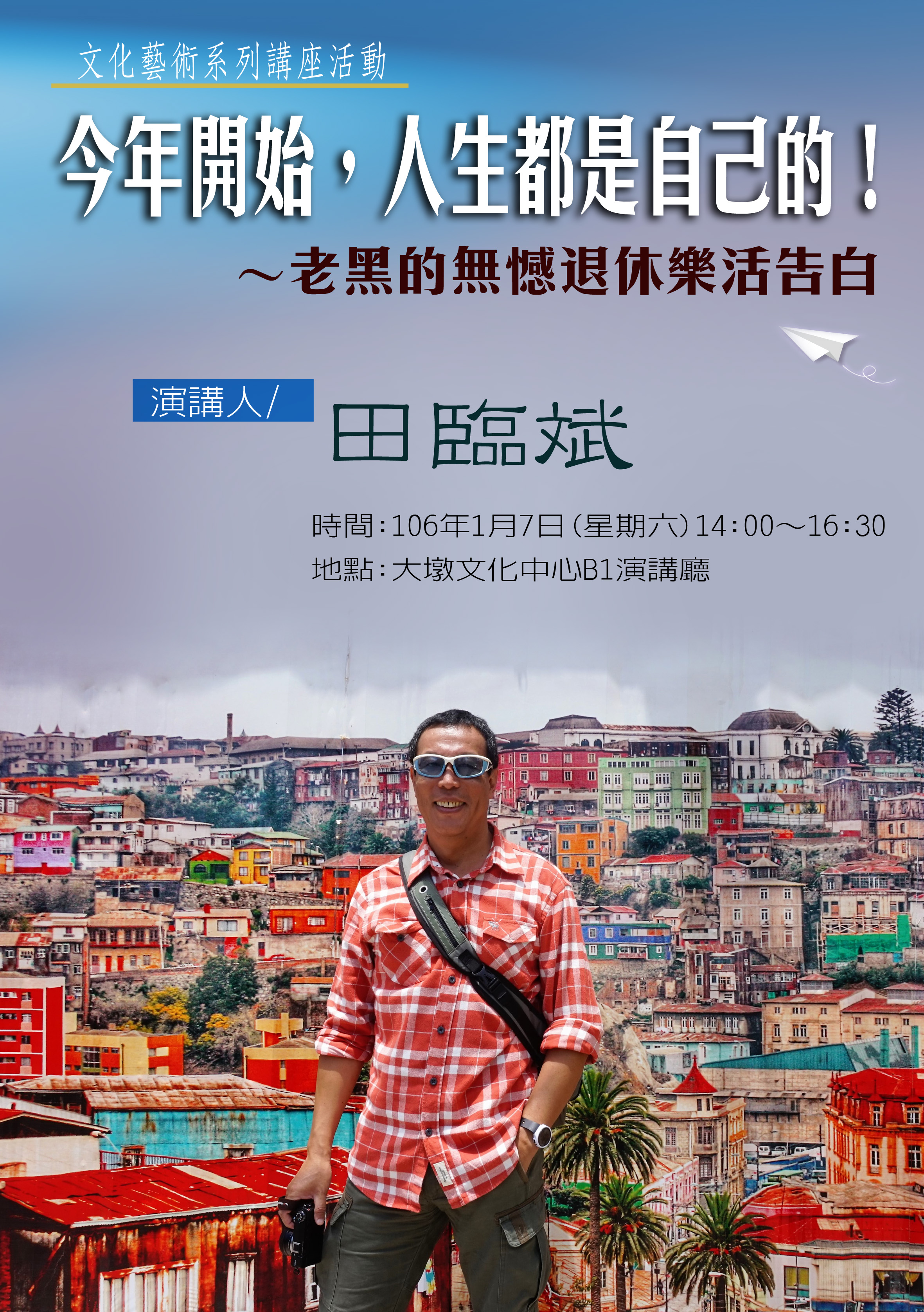 大墩文化中心邀請田臨斌先生以「今年開始,人生都是自己的!老黑的無憾退休樂活告白」為主題進行講座動,請鼓勵踴躍參加。