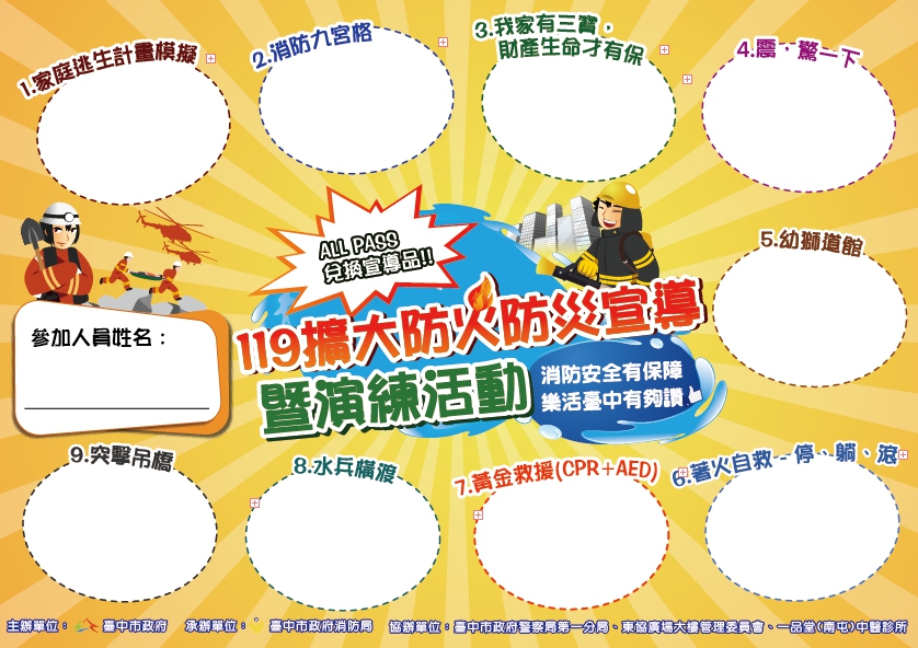 消防局106年度119擴大防火防災宣導暨演練活動–「消防安全有保障,樂活臺中有夠讚」,現場將架設舞台表演創意舞蹈及防火防災宣導短劇以外,並邀請到專業模特兒到場,穿著各式臺中消防新式服制走秀,還有東協廣場大樓自衛消防編組演練及各式消防闖關體驗區等,今年另外還特別舉辦了小朋友消防寶可夢遴選活動(開放30個名額,供本市4-10歲小朋友報名),寓教於樂以打造友善安全城市為目標,確保民眾平安歡度農曆新年。