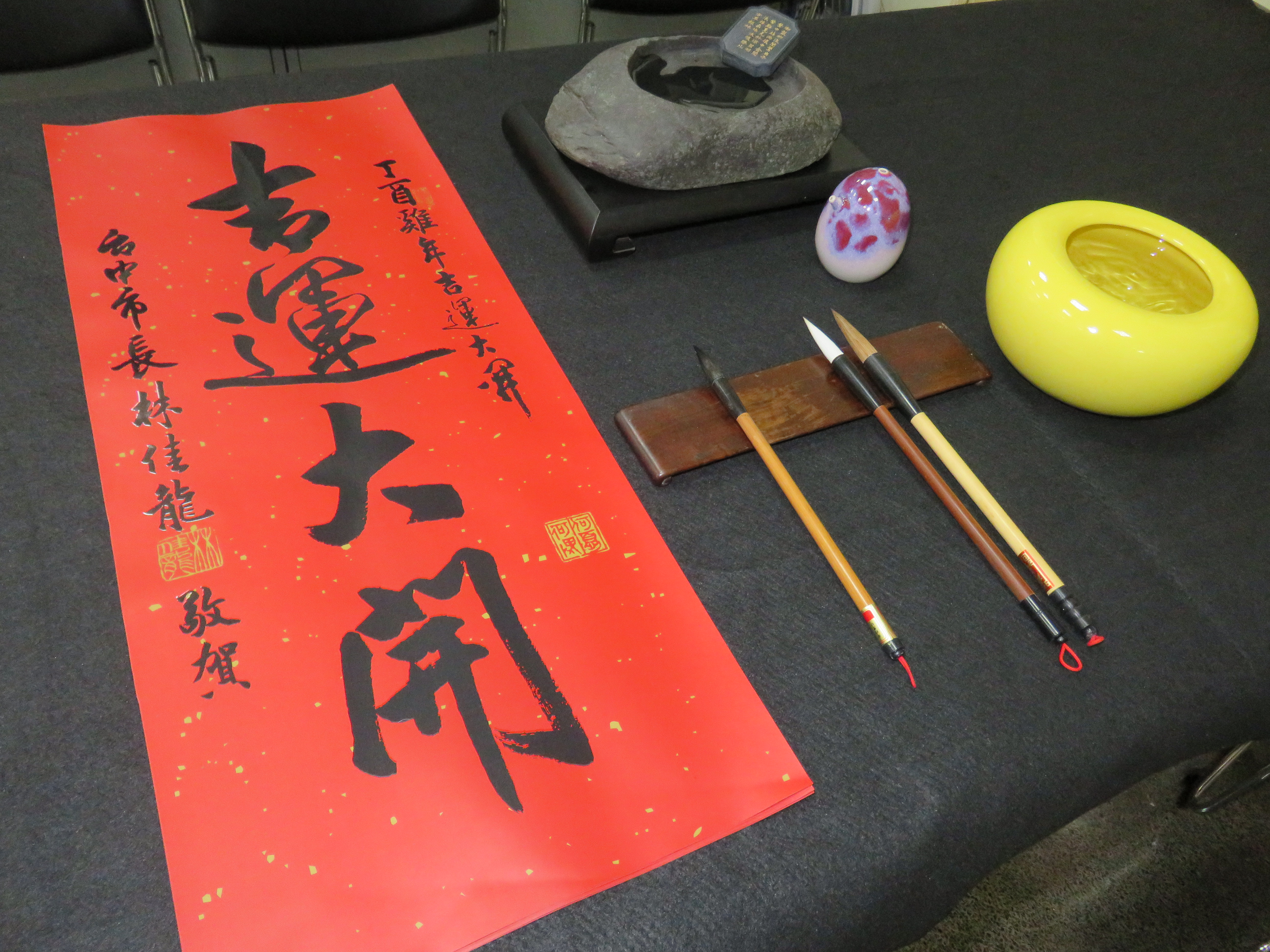 林佳龍市長今年續邀請曾三次拿下臺灣省美展書法第一名、獲得終身免審查殊榮的書法名家蕭世瓊揮毫,以「吉運大開」賀聯祝福民眾新春好運到,而這吉運念起來也像機運,非常符合雞年意象。「吉運大開」用行書體書寫,平穩流暢,歡迎民眾索取,數量有限,送完為止。