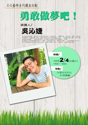 大墩文化中心邀請昆蟲老師吳沁婕以「勇敢做夢吧!」為題,進行講座活動。吳沁婕,臺大昆蟲系畢業,現在是大小朋友都愛的〈昆蟲老師〉、暢銷作家。她愛寫、愛畫、愛旅遊與愛攝影,陸續出版《More Than Wonderful 我的過動人生》、《昆蟲老師上課了!吳沁婕的超級生物課》、《勇敢做夢吧!不走都不知道自己有多厲害》…等書。因為她從小就是個非典型孩子,過動、喜歡帥氣打扮、養好多甲蟲…,在在都與很多人不一樣,而她相信人生從來不是公平的,每個人都獨一無二。分享她如何翻轉挫折轉換為自己成長的能量。