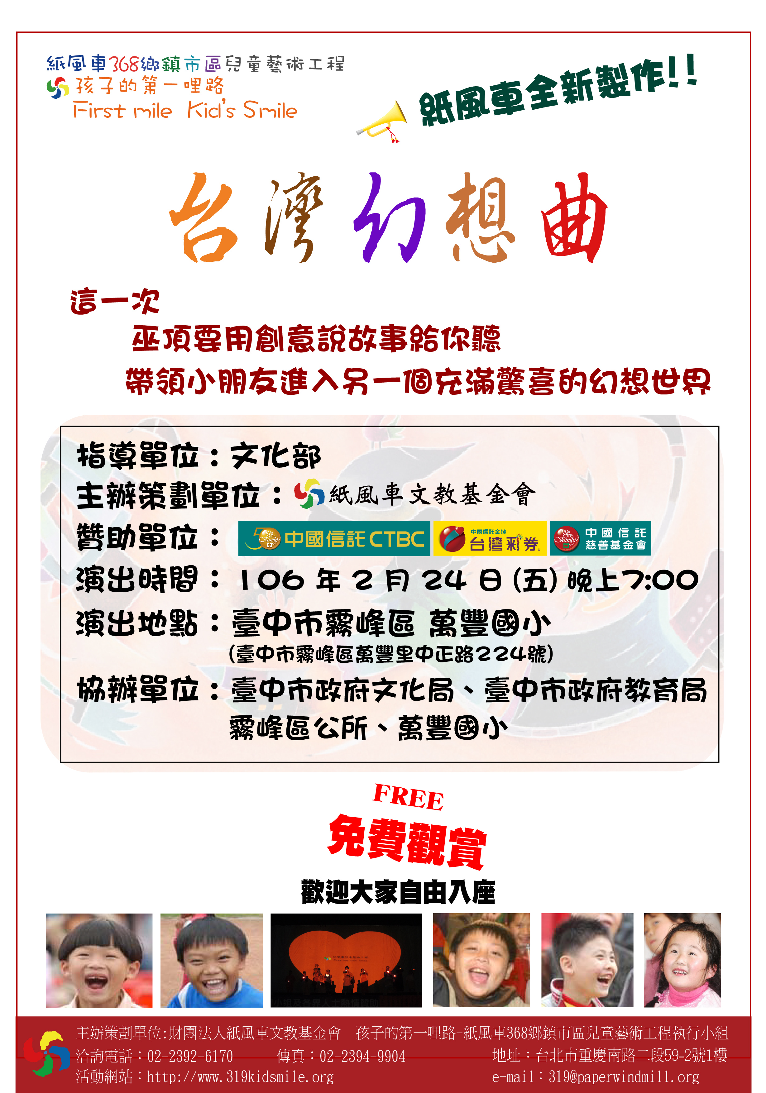紙風車文教基金會訂於106年2月24日(星期五)晚上7時至9時於本區萬豐國民小學操場(霧峰區萬豐里中正路224號)舉行「紙風車368鄉鎮市區兒童藝術工程-兒童戲劇節目演出」活動,本活動為「中國信託金融控股公司、中國信託台灣彩券、中國信託慈善基金會」及各界人士贊助,演出劇目為「台灣幻想曲」。