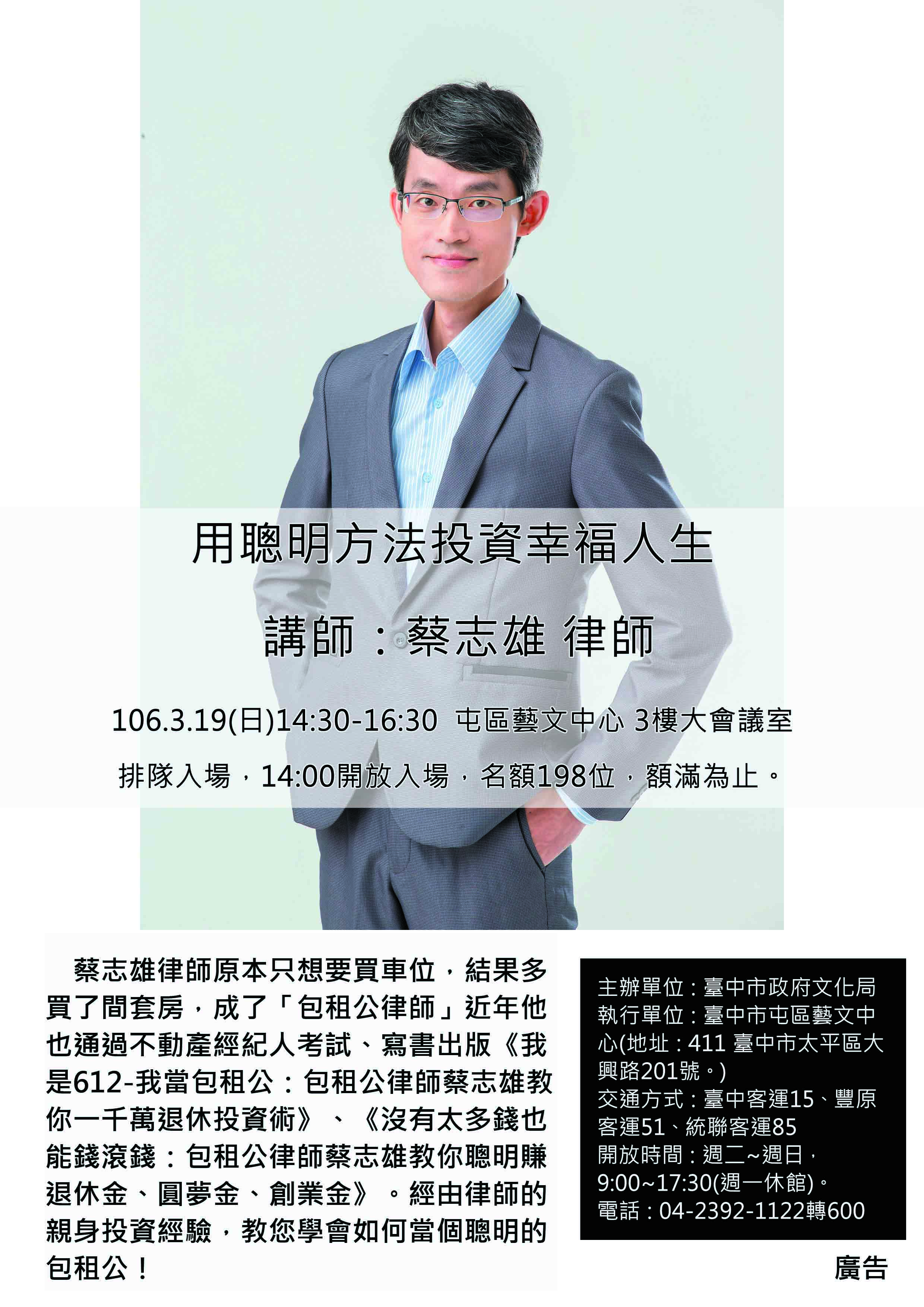 本活動辦理時間為106年3月19日(日)14:30-16:30;地點為屯區藝文中心3樓大會議室(臺中市太平區大興路201號),採排隊入場,座位198席,額滿為止。