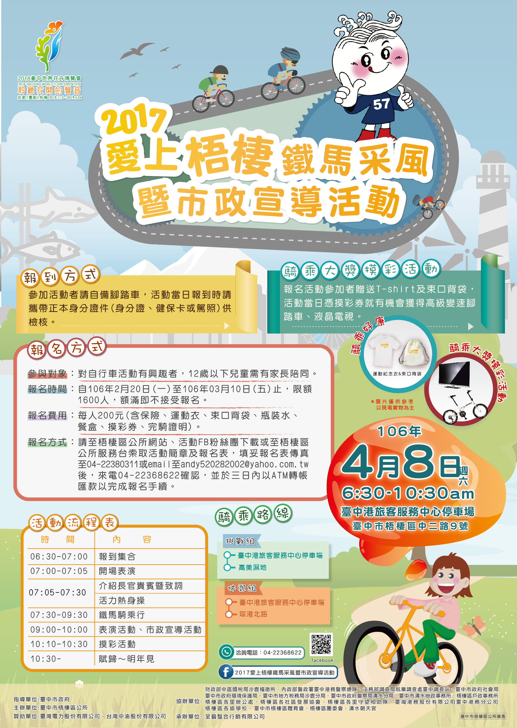 二、活動時間、地點:106年4月8日(星期六)上午6時30分至10時30分假臺中港旅客服務中心停車場(梧棲區中二路一段9號)辦理,報名時間即日起至106月3月10日止,額滿截止。