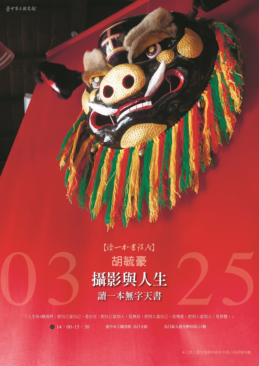 第二場講座邀請攝影專家胡毓豪分享「攝影與人生--讀一本無字天書」,帶領民眾從自己的人生取材,拍出瞬間的美好與感動。
