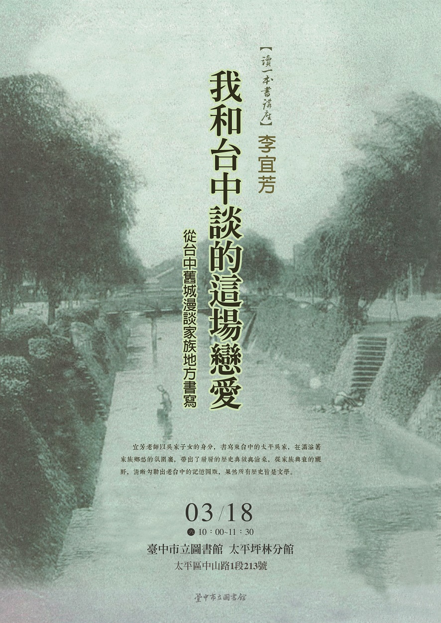 一、第一場講座邀請作家李宜芳分享「我和台中談的這場戀愛--從台中舊城漫談家族地方書寫」,從太平吳家的興衰歷史勾勒出老臺中的記憶圖版。