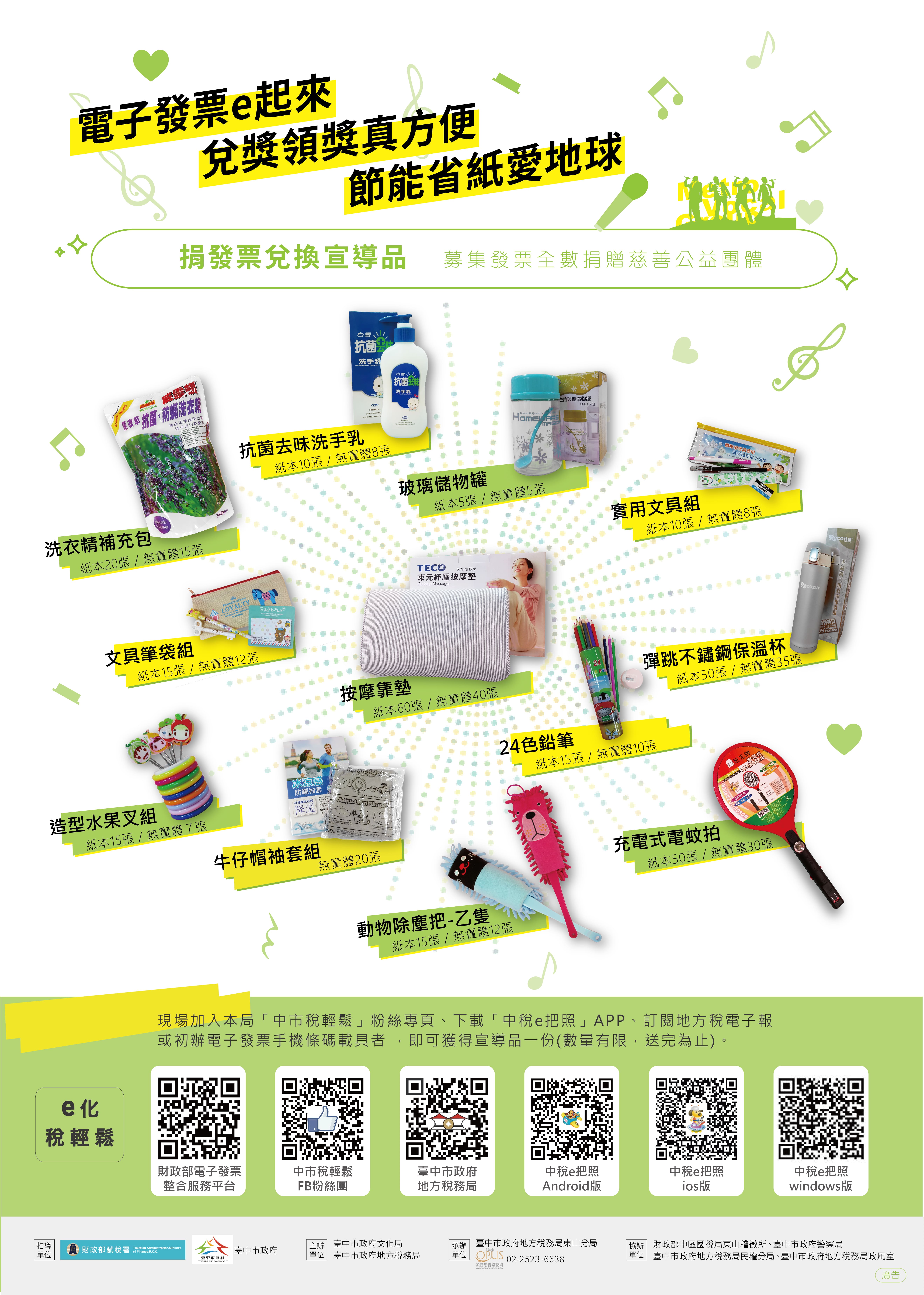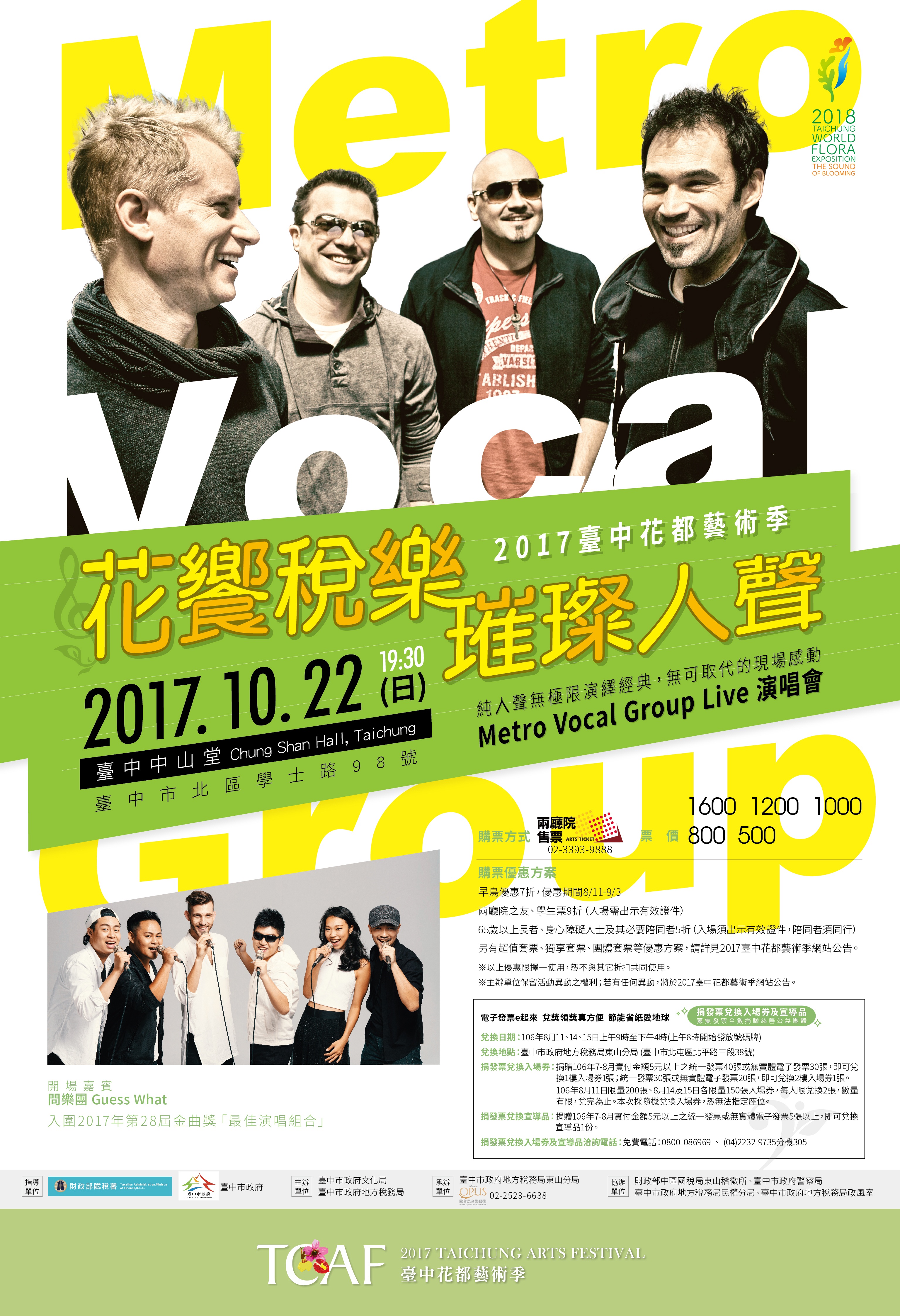 臺中市政府地方稅務局東山分局訂於106年10月22日(星期日)假臺中市中山堂舉辦「2017花都藝術季-花饗稅樂 璀璨人聲 Metro Vocal Group演唱會」,並於8月11、14、15日舉辦捐發票兌換入場券活動,詳情請上稅務局網站查詢。